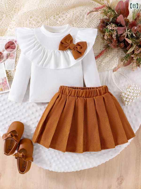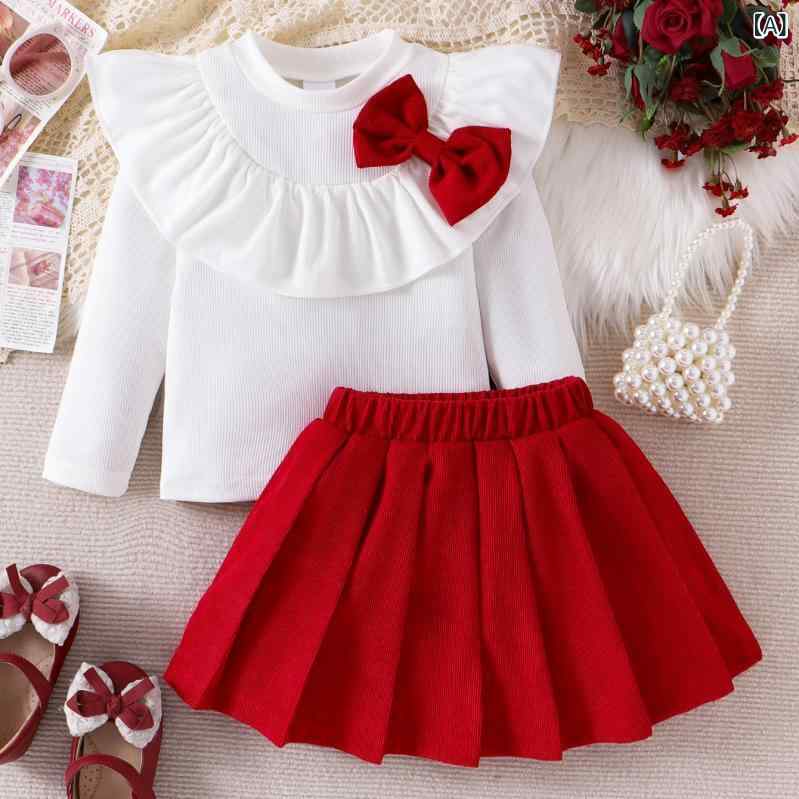 スカートセット キッズ 女の子 子供服 秋冬 蝶ネクタイ リボン フリル襟 長袖 トップス 赤 レッド プリーツスカート 綿 コットン 柔らかい ソフト 快適 お出かけ 普段着 通園 通学 発表会 フォーマル