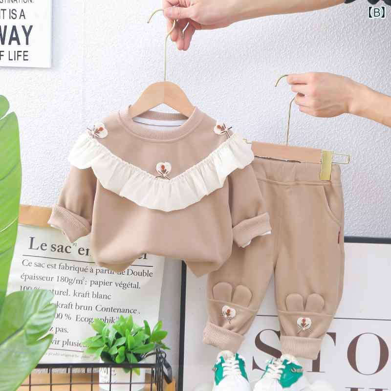 セットアップ キッズ 女の子 女児 ベビー 春秋 フリル うさぎ ラビット キャラクター 2点セット 上下セット 長袖 パンツ コットン 綿 柔らかい肌触り カジュアル 普段着 ピンク カーキ