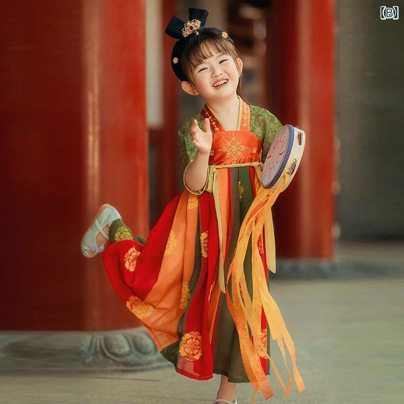 チャイナドレス 女の子 子供 再生繊維 ポリエステル 薄手 柔らか 敦煌 漢服 唐装 中国風 古典衣装 プリンセス かわいい 春夏 発表会 イベント 衣装 オレンジ