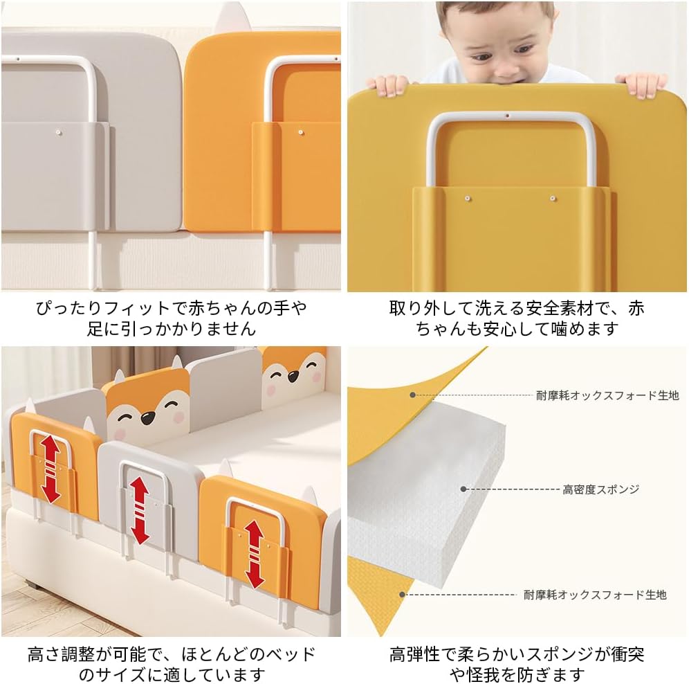 【カラー】 グレー、イエロー 乳牛50cm グレー50cm キツネ50cm イエロー50cm 乳牛60cm グレー60cm キツネ60cm イエロー60cm サイズ:幅50/60 cm、厚さ6.5 cm、高さ38 cm 材質:オックスフォード生地 【商品の説明】 かわいい柄に明るいカラーを組み合わせることで、4つの異なるタイプを組み合わせても可愛くておしゃれなお部屋になります。 赤ちゃんの0-1歳は目の発育の肝心な時期で、物体を識別するのははっきりしていなくて、いくつかのぼんやりした図案は赤ちゃんの視覚発育に不利です。シンプルで立体的なデザインは視力の開発に役立ちます。 年齢層の異なる赤ちゃんと赤ちゃんの習慣に合わせて、異なる形状の保護をカスタマイズします。このベッドフェンスは赤ちゃんの安全を守るだけでなく、高齢者や患者のベッドにも設置でき、転落などの危険を防ぐことができる。 【この商品について】 【安全素材】表面は耐摩耗性のオックスフォード生地を採用し、取り外して洗えます、赤ちゃんが噛んでも大丈夫です。内部の高密度スポンジは弾力性に優れており、効果的に衝撃を緩和し、衝突による赤ちゃんの怪我を防ぎます。 【高さ調節可能・組み合わせ自由】マットレスの厚みに合わせて高さを自由に調節でき、ベッド面にぴったりフィットします。幅50cmと60cmの2サイズを様々な形に自由に組み合わせることができます。 【落下防止】38cmと科学的な高さで、赤ちゃんがベッドから落ちることを防ぐだけでなく、視線も妨げず、ママはいつでも赤ちゃんの様子を観察できます。夜間の消灯や物の取り出し、ベッドへの出入りも妨げません。 【緊密に接合】普通のベッドフェンス ではベッド面に完全にフィットせず、つながっている部分にも隙間があり、赤ちゃんの手足を挟むなどの危険があります。当店のベッドフェンス は緊密に接合されており、隙間を残さず、赤ちゃんにとってより安全で隠れた危険はありません。 【丈夫なサポート】頑丈な鋼管サポート、半分の鋼管がマットレスの下に挿入されているため、より安定しており、赤ちゃんが寄りかかっても安全です。取り付けも簡単で、ママ一人でもすぐに取り付けが完了します。 ※簡易包装となりますのでご理解の程よろしくお願いします。 ※手動測定による1・3cmの測定偏差を許容してください。 ※モニターや光の効果が異なるため、実際の色は写真の色と若干異なる場合があります。 ※仕様・デザインは改良のため予告なく変更することがあります。 メーカー希望小売価格はメーカーカタログに基づいて掲載しています 不良品についての説明基づいて掲載しています