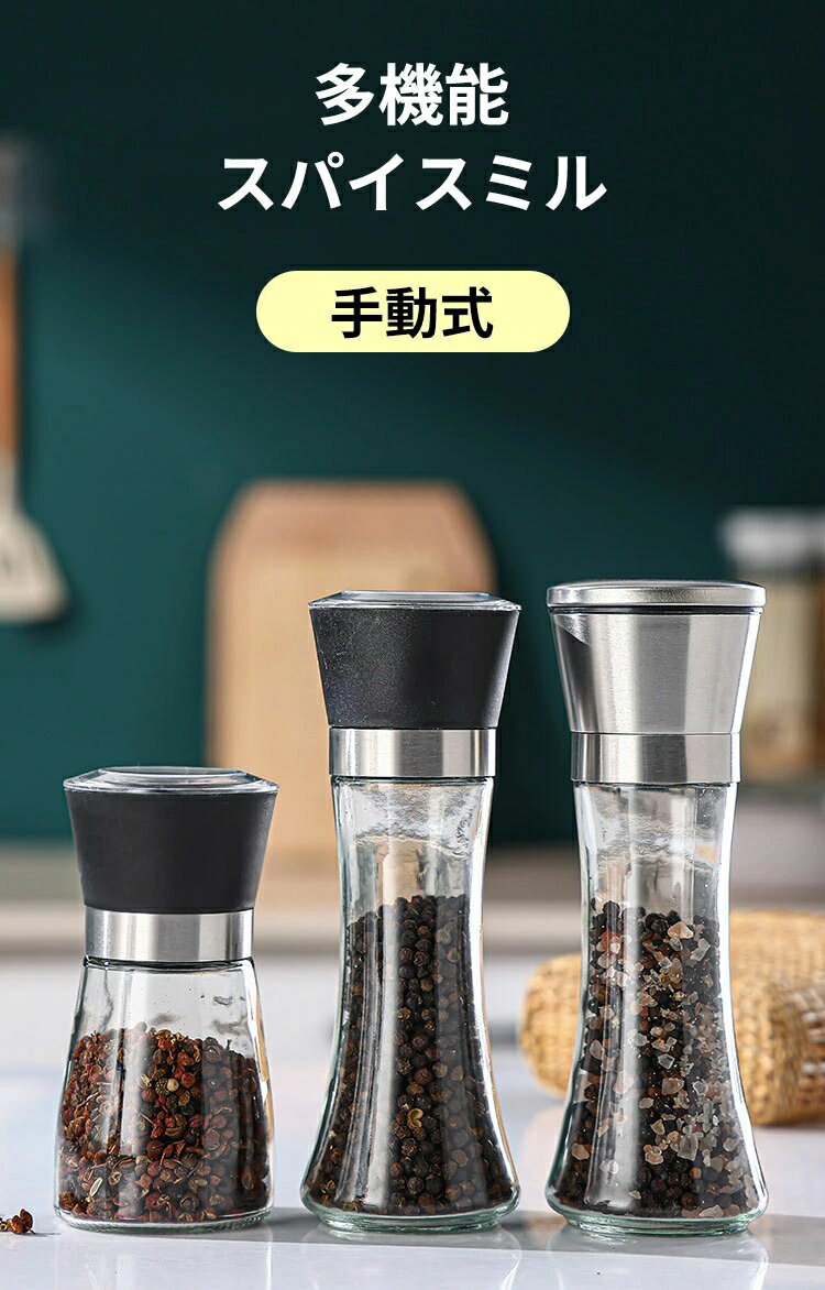ペッパーミル スパイスミル 手動式 ごますり器 岩塩 ミル 粗さ調節 シンプル 黒胡椒 胡椒ミル 洗える スパイス ソルト コショウ 塩 胡椒ひき ガラス ステンレス蓋 セラミック製刃 使いやすい キチン用品