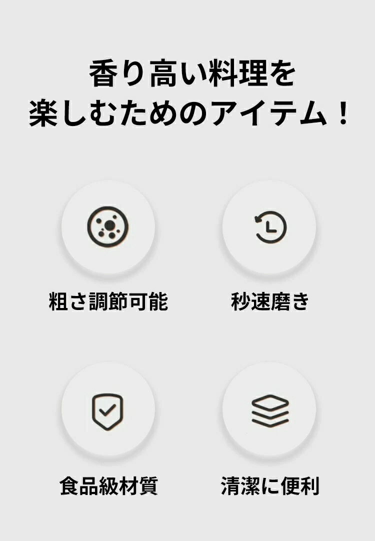 商品説明商品紹介毎日の料理を一層楽しく、便利にするアイテムです。このミルは、ガラス製の本体とセラミック製の刃を備えており、粗さの調節が可能です。操作は非常に簡単で、分解して洗うことができるため、いつでも清潔に保つことができます。 ステンレス製のキャップは耐久性が高く、食品級の安全な材質を使用しているため、安心して使用することができます。さらに、このミルは黒胡椒、岩塩、その他のスパイスにも使用できるため、汎用性が非常に高いです。キッチンでの日々の調理はもちろん、テーブル上での使用にも最適です。 シンプルでモダンなデザインは、どんなキッチンにもぴったり合い、料理のプロセスをより楽しく、そしてスタイリッシュに彩ります。毎日の食事作りに役立つこのミルで、食卓をもっと豊かにしましょう。生産国中国注意事項モデル写真に使用されているアクセサリー小物は別途記載が無い限り付属いたしません。 商品写真はできる限り実物の色に近づけるよう加工しておりますが、お客様が使用するパソコンのモニター設定や部屋の照明により多少、色の変化が感じられる場合がございます。 実際の色に近づけるため、タグのカラー名称と異なる場合がございます。 商品のサイズは、全て平置きにて外寸を測定しております。実寸は商品によって若干の誤差(1cm〜3cm )がある場合がございますので、予めご了承ください。 同じ商品でも「生産時期」や「カラー」により形やサイズに多少の「誤差」が生じる場合もございます。詳しくは商品画像や実寸サイズにてご確認くださいませ。
