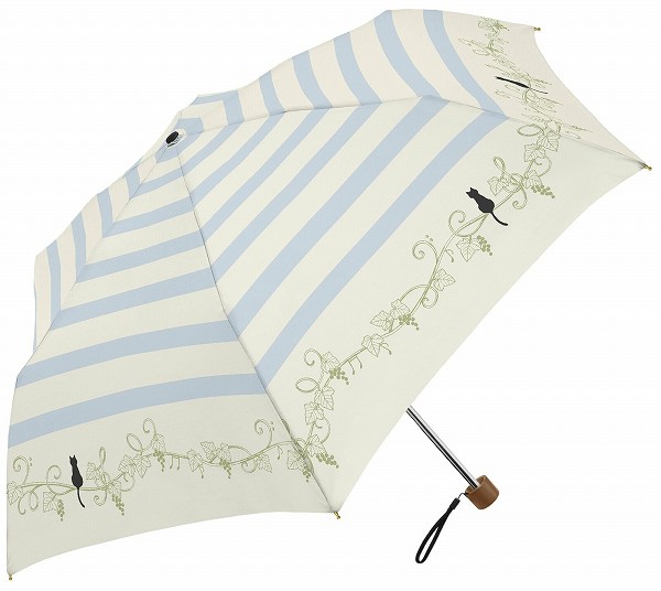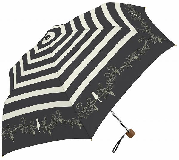 ボーダープリントに、葡萄のツタモチーフにちょこんとのっかっている猫ちゃんが大人かわいい晴雨兼用折りたたみ傘。 この葡萄のツタがところどころト音記号やヘ音記号になっていて、♪モチーフもついてるんです!!音楽好きさんへのプレゼントとしてもぴったりなんですよ♪ ホックボタンは猫のあしあとの型押しボタンになっています。 生地裏面に黒のポリウレタンコーティング加工を施しており、遮光&紫外線遮蔽率&遮熱効果に優れた機能性パラソル。 はっ水・防水加工も施されているので、とっさの雨でもお使いいただけます。 ★遮光率&紫外線遮蔽率は全色99.9%以上(UPF評価 全色50+) バッグに入れておきやすく、持ち運びしやすいスタンダードな折りたたみタイプ。 はっ水・防水加工も施されているので、とっさの雨でもお使いいただけます。 強度と柔軟性に優れたガラス繊維強化プラスチック「グラスファイバー骨」を使用。強風で「おちょこ」になっても簡単に元に戻り、折れにくい風に強い設計の骨です。 親骨をポキポキ折らずとも簡単に開閉ができる折りたたみ傘です。 傘を閉じる際に爪や指を挟まないよう、ボタン式の安全ろくろ付き。 サイズ・容量 親骨の長さ:50cm 骨の本数:6本 全長:約51.5cm 直径:約89cm 重量:約205g 収納時長さ:23cm 素材・成分: 生地:ポリエステル100%/裏面黒PUコーティング加工 ★遮光率99.9%以上/UVカット率99.9%以上/UPF50+ 手元:木 親骨&受骨:アルミ&グラスファイバー 中棒:スチール&アルミ お届けまでに1週間程度かかる場合があります。 北海道・沖縄・離島へは別途送料が必要となります。在庫更新のタイミングにより、在庫切れの場合はキャンセルさせていただく可能性があります。