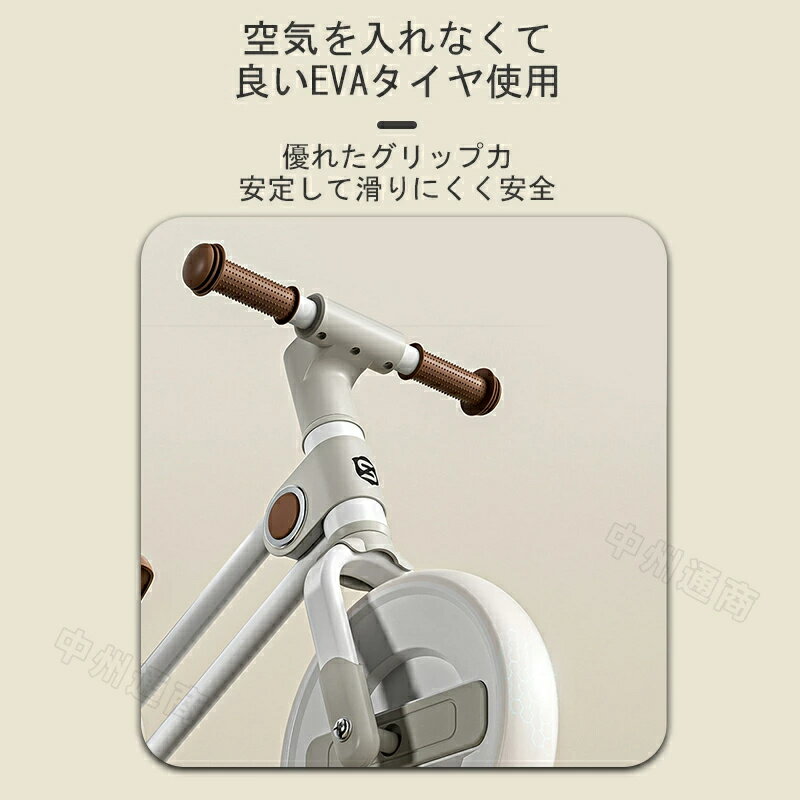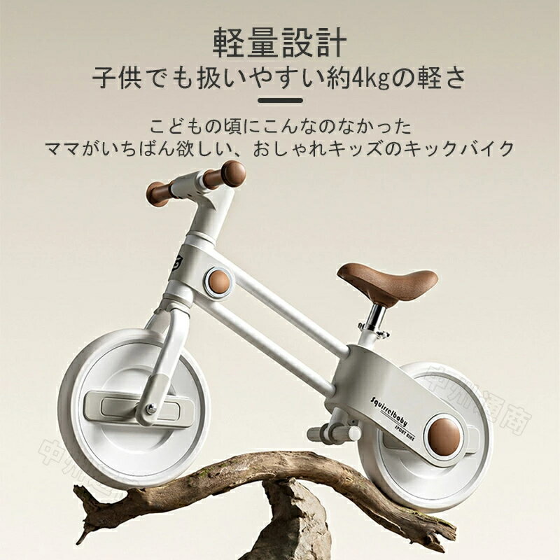 ・自転車デビュー前にバランス感覚を鍛えよう!キックで進むペダルなしバイク。 ・自分で持てる、軽量約4kg。 ・ハンドルとサドルは高さ調節でピッタリサイズに! ・ノーパンクタイヤで空気注入の手間なし。 ・組み立ては必ず大人の方が行い、その際に指を挟まないようご注意ください。 ・乗車する際は必ずヘルメットやプロテクターを着用してください。 ・キッズバイクは自転車ではなく遊具に該当するため公道では走行せず、公園などの広い場所で走行してください。 ・遊ぶときは必ず保護者が同伴し、お子さまから目を離さないでください。 ・定期的にネジを締め直したり、本体やパーツに破損がないかチェックしてください。 2歳中ごろから乗ることで、二輪車の感覚を身に付けることができ、 補助輪なしの自転車への移行も非常にスムーズです。 店長イシダの息子は2歳中ごろからキッズバイクに乗り、 3歳中ごろに練習30分で補助輪なし自転車に乗れるようになりました。 ほんとうにおススメです!
