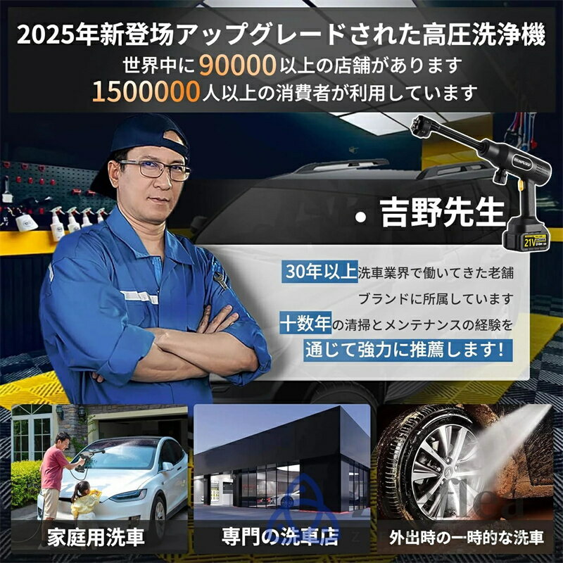 ★【6in1多機能と泡立つ】 2025年最新人気モデルコードレス洗浄機は0°/15°/25°/40°/ファン/シャワー等6つのモードを1つのノズルに合わせています。ノズルの先端を回転させることで、噴射角度を切り替えます。洗剤を泡瓶に入れてから、泡ノズルから細かい泡を噴きます。高圧洗浄機は、車、バイク、自転車などを簡単に洗えます。さらに、バルコニー 外壁 廊下 屋外 階段 外壁 お風呂場とベランダなど清潔清掃にも大活躍です。また、年末大掃除 業務用 キャンプ用品のお手入れ、植物への散水、泥のついた農産物の洗浄にも役立ちます。お家に一台を持つと便利! ★【大容量バッテリー】 このワイヤレス充電式の高圧洗浄機は5段バッテリー1.5Ahのバッテリーを搭載していますので、市販品より2倍バッテリーを持ちます、ご使用中に電池量不足の心配がなく、楽々ご愛車を洗えます。フルまで充電したら最大1時間まで連続的に使えます(初めてご使用する前にバッテリーをフルまで充電してください)、頻繁に充電の手間が要らなく、電池を購入するお金も節約できます。供水には、フィルターが付いたホースを水が入ったタンクに入れて、簡単に給水できます。 ★【最新強力モーター搭載】 新しくアップグレードされたブラシレス高性能純銅モーターを搭載しており、強力な安定性と耐久性と強力なパワーの効率を向上されます。それに過電流保護、過電圧保護、過熱保護、充放電保護、アップグレードされた高効率プランジャーブースターポンプを取り付けています、駆動力は450ワットで、強力な圧力と安定して稼働できて、市販品より随分長持ち、頑固な汚れでも綺麗に洗えます。 ★【持ち運びに便利】 この高圧洗浄機は、ワイヤレス式コンパクトで軽量な設計で、本体とバッテリーの合計重量は約1.2kgです。人間工学に基づいたデザインで、握りやすく、背の小さい女性でも簡単にかつ安ぜんに使えます。収納ボックスが付属しており、洗浄機とアクセサリーを整理して収納できます。洗車場へ便利に持ち運べます、そして場所に問わず、いつでもどこでも簡単に清掃作業が行えます。 ★【洗車スタッフ監修】 この電動高圧洗浄機は既にPSE認証済です、お客様があんしんにご使用いただけますように品質を厳しく把握しております。色々場所に使えるので、ご家族やお友達などご大切な方へのギフトとしても良いです。 ★【同梱内容】 本体*1、給水管*1、フォームポット* 1、携帯用のコーラ瓶のコネクタ*1、水質フィルター*1、6IN1ノズル*1。 ★【商品仕様】 ◆連続使用時間:約40分 ◆給水方式:自吸式(専用5mホース) ◆最大吐出水量:7.0L/min ◆モーター出力:約400W ◆使用水温度範囲:0~50℃
