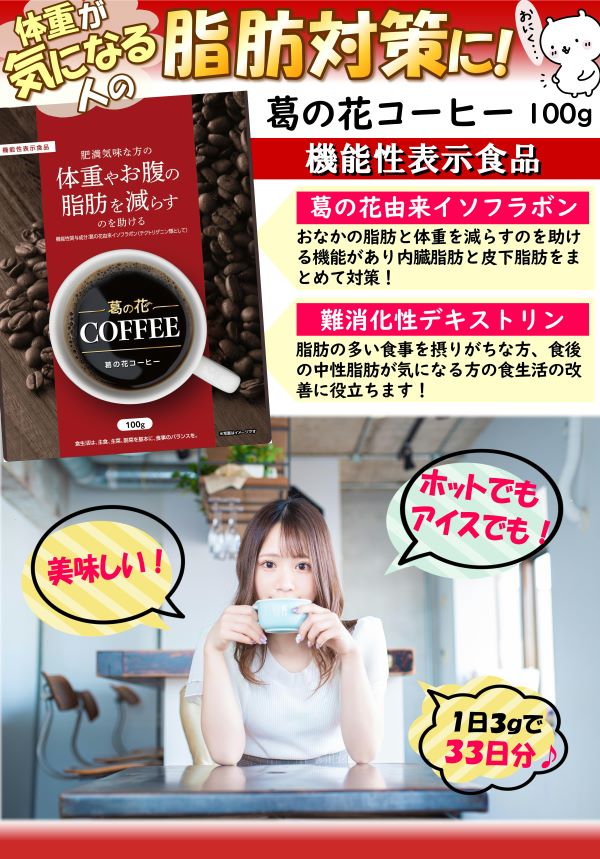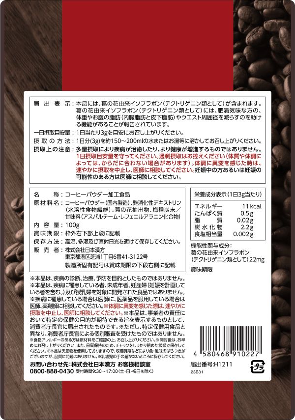 ■商品名 葛の花コーヒー 100g ■商品説明 ・機能性関与成分「葛の花由来イソフラボン(テクトリゲニン類として)」を配合した、肥満気味の方の体重やお腹の脂肪を減らすのを助けるコーヒーです。 ・難消化性デキストリンも含有されているため、脂肪の多い食事を摂りがちな方、食後の中性脂肪が気になる方の食生活の改善に役立ちます。 〇葛の花イソフラボン(テクトリゲニン類として)とは マメ科植物である葛の花から抽出した成分です。 余ったエネルギーが肝臓で脂肪に合成されるのを抑制し、白色脂肪細胞(体内の脂肪のほとんどを占める細胞)内での脂肪の分解と褐色脂肪細胞(脂肪を分解して燃焼させる作用のある細胞)内での脂肪の消費を促進することで、おなかの脂肪を減らす効果があることが報告されています。 ■機能性表示食品(届出番号:H1211) 本品には、葛の花由来イソフラボン(テクトリゲニン類として)が含まれます。 葛の花由来イソフラボン(テクトリゲニン類として)には、肥満気味な方の、体重やお腹の脂肪(内臓脂肪と皮下脂肪)やウエスト周囲径を減らすのを助ける機能があることが報告されています。 ■栄養成分表示(1日3g当たり) ・エネルギー:11kcal ・たんぱく質:0.5g ・脂質:0.02g ・炭水化物:2.2g ・食塩相当量:0.002g 機能性関与成分:葛の花由来イソフラボン(テクトリゲニン類として)22mg ■原材料名 コーヒーパウダー(国内製造)、難消化性デキストリン(水溶性食物繊維)、葛の花抽出物、梅種炭末/甘味料(アスパルテーム・L-フェニルアラニン化合物) ■お召し上がり方 3gを約150〜200mlの水またはお湯等に溶かしてお召し上がりください。 ※1日摂取量 3g目安 ■使用上の注意 ・本品は、疾病の診断、治療、予防を目的としたものではありません。 ・本品は、疾病に罹患している者、未成年者、妊産婦(妊娠を計画している者を含む。)及び授乳婦を対象に開発された食品ではありません。 ・疾病に罹患している場合は医師に、医薬品を服用している場合は医師、薬剤師に相談してください。 ・体調に異変を感じた際は、速やかに摂取を中止し、医師に相談してください。 ・本品は、事業者の責任において特定の保健の目的が期待できる旨を表示するものとして、消費者庁長官に届出されたものです。 ただし、特定保健用食品と異なり、消費者庁長官による個別審査を受けたものではありません。 ・食物アレルギーのある方は原材料をご確認の上、お召し上がりください。 ・開封後は、お早めにお召し上がりください。 また、品質保持のため、チャックをしっかり閉めた状態で保存してください。 ・本品は天産物を使用しておりますので、収穫時期などにより色・風味のばらつきがございますが、品質に問題はありません。 ・乳幼児の手の届かない所に保存してください。 ■生産国 日本 ■販売者 株式会社日本漢方 東京都港区芝浦1丁目6番41-3122号 ■お問い合わせ先 株式会社日本漢方 お客様相談室 電話:0800-888-0430 受付時間:9:30〜17:00(土、日、祝日を除く) ※パッケージデザイン・内容量等は予告なく変更されることがあります。葛の花コーヒー 100g 内臓脂肪 皮下脂肪 ダイエット 葛の花由来イソフラボン コーヒー 機能性表示食品 梅種炭配合 BMI 体脂肪 体重やお腹の脂肪が気になる方に!1日3gで33日分♪ 5