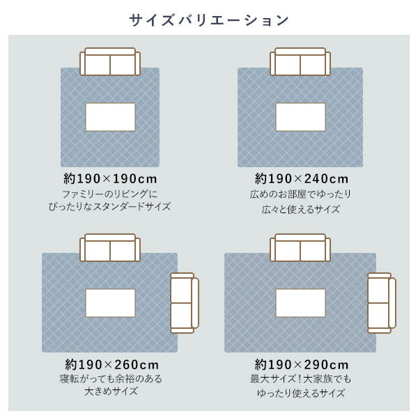 ■サイズ・色違い・関連商品■ラグ単品 約190×190cm デニム生地 ブラック■ラグ単品 約190×190cm デニム生地 カーキ■ラグ単品 約190×190cm デニム生地 グレー■ラグ単品 約190×190cm デニム生地 ネイビー■ラグ単品 約190×240cm デニム生地 ブラック■ラグ単品 約190×240cm デニム生地 カーキ■ラグ単品 約190×240cm デニム生地 グレー■ラグ単品 約190×240cm デニム生地 ネイビー■ラグ単品 約190×260cm デニム生地 ブラック■ラグ単品 約190×260cm デニム生地 カーキ■ラグ単品 約190×260cm デニム生地 グレー■ラグ単品 約190×260cm デニム生地 ネイビー■ラグ単品 約190×290cm デニム生地 ブラック■ラグ単品 約190×290cm デニム生地 カーキ[当ページ]■ラグ単品 約190×290cm デニム生地 グレー■ラグ単品 約190×290cm デニム生地 ネイビー■こたつ掛け布団単品 約205cm丸(90cm円形のこたつ台に適応) つむぎ生地 グリーン■こたつ掛け布団単品 約185×225cm楕円(65〜75×105〜120cm円形こたつ台に対応) 刺し子生地 ネイビー関連商品の検索結果一覧はこちら■商品内容こだわりの無地調キルトラグ・繊細な風合いが美しい、先染め生地・中綿たっぷりでふっくらと、あたたかく・クッション性があるやわらか構造・手洗いOKなので、年中清潔■3種の繊細な色合いの先染め生地先染めの生地を使用することで、品のある無地調のこたつ布団に。※先染めとは?先に糸を染色し、そのあとに織る生地のこと。糸全体が染まっていることで、深みのある色合いが生まれます。・デニム柄/4カラー・つむぎ柄/4カラー・刺し子柄/2カラー■年中さらりと使えるキルトラグコットンラグなのでサラっとした肌触りでオールシーズン快適。・高い吸水性で夏でもサラリと・静電気が起こりにくく、冬も最適・すべり止め加工・ホットカーペット&床暖房対応・毛足短くお手入れらくらく・軽量&コンパクトで収納場所を選ばない■ふっくらと暖かく心地よい中材にウレタンと綿を使用した、4層仕立ての柔らかな感触。・表地(綿100%)・中空ポリエステル綿・ウレタン10mm・すべり止め付き裏地※表地はキルティング仕様でふんわりと仕上げました。■手洗いOKで年中快適手洗いできるので毎日清潔です。※お手入れは洗濯表示に従って行ってください。誤ったお手入れは、品質低下・破損の原因となります。■同シリーズのこたつ布団もおすすめ・同柄でお洒落に・冬はこたつの敷布団として■サイズ・約190×190cm・約190×240cm・約190×260cm・約190×290cm■商品スペック【サイズ(約)】<正方形>・190×190cm<長方形>・190×240cm・190×260cm・190×290cm【材質】表地:綿100%裏地:ポリプロピレン不織布100%(ドット滑り止め加工)中材:(上層)中空ポリエステル綿100%、(下層)ウレタンフォーム10mm【洗濯表示】・手洗い 40℃以下の水温で、弱い手洗いがよい。(洗濯機は使用できません。)【原産国】中国【ご注意事項】・こたつ敷き布団単品は現在、デニム生地のみの販売となります。その他つむぎ生地・刺し子生地は完売いたしました。・圧縮梱包のため、開封後お客様都合での返品は不可となります。あらかじめご了承ください。【配送日時指定について】・この商品は、配送希望日と時間帯をご指定可能です。・配送希望日は出荷目安(最長)の 3 - 30 日後の間でご指定ください。・最短でのお届けをご希望の場合は「指定なし」を選択してください。※配送エリア(例:沖縄・離島)により、配送希望日のご指定をお受けしかねる場合がございます。【商品の色やサイズについて】画像や商品情報には、色違いやサイズ違いの商品が載っている場合がございます。ご注文前に色・サイズ・セット内容のご確認をお願いいたします。■送料・配送についての注意事項●本商品の出荷目安は【1 - 4営業日 ※土日・祝除く】となります。●お取り寄せ商品のため、稀にご注文入れ違い等により欠品・遅延となる場合がございます。●北海道・沖縄・離島への配送については別途追加送料が発生します。 また商品・地域によっては配送出来ずキャンセルをさせて頂くケースもございます事、ご了承下さい。