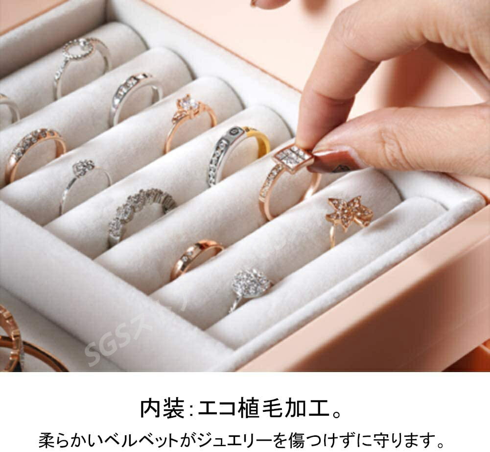?【商品仕様】:サイズ(約)28cm * 18cm * 24cm。重量約2kg。 プレゼントとして最適。外観とデザインが可愛くおしゃれで、実用性もあるので。誕生日プレゼント、母の日、入学祝い、卒業祝いや入社祝いなどの贈り物としてはオススメ。 ?【防水防塵】:透明防塵カバーは化粧品をホコロや水から清潔に保ち、水で濡れても心配なし、清掃の手間も省くことができます。左右のドアは簡単に開けられるので、イヤリング、ピアス、ネックレスをきれいに収納できます。 複数のフックがあるので、ネックレスが長すぎて収まらないことを心配する必要はありません。 ?【多機能?大容量】:リング、ネックレス、イヤリング、サングラス、時計、それぞれのタイプには特定の収納スペースがあります。 今までバラバラにあったアクセサリーをとてもきれいに収納することが出来ました。仕分けもとても簡単。すぐに使用したいものを見つけることも出来て、便利このうえないです。 ?【特徴なデザイン】:スタイリッシュでシンプルな外観は、どこに置いても快適です。ボックスの上部には可動ハンドルがあり、結婚式のシーンや旅行に持っていくことができます。 プラスチック素材ですので、特にお手入れが簡単で、水だけで拭き取れ、不快な臭いもありません。 そのため、化粧台の上に置くだけでなく、洗面台の横に置くこともできます。水がかかっていてもかまいません。 これは、pu素材のジュエリーボックスでは不可能です。 メーカー希望小売価格はメーカーカタログに基づいて掲載しています