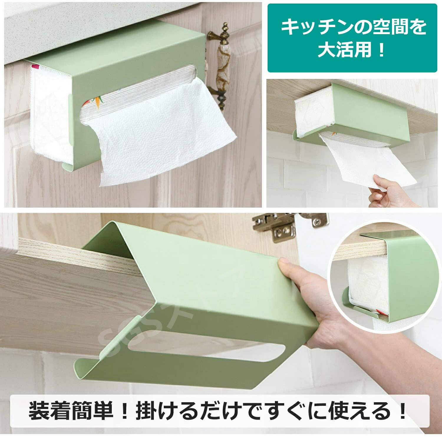 これは便利!キッチンのキャビネット上部空間を活用!戸棚の下に取り付けられるペーパータオルホルダーになります。この製品は1枚ずつ取り出すタイプのペーパータオルを保管する場所を生み出すとともに、使い勝手の向上が期待できるペーパータオルケースになっています。 ペーパータオルは様々な種類が出ていますが、箱などに入って1枚ずつ取り出すタイプの場合、これまでは台の上やキャビネットの上など、とりあえず箱を無雑作に置いて使用していた経験はないでしょうか。それでも使用する上で支障はないのかもしれませんが、キッチンを整理整頓すると言う観点から考えればあまり好ましいものではありませんでした。 そこでこのキッチンボックスハンガーを使用することにより、今まで決められた場所がなかったペーパータオルに置き場所を作ると共に、開いた頭上の空間を生かして散らかりがちなキッチンの空間を少しでも広げられるとても便利な収納アイテムです。 このキッチンペーパーホルダーは、物などを収納する棚の一番下の部分などを活用して取り付けます。箱ティッシュなどと同じで1枚ずつ取り出すペーパータオルの場合、平置きで使用するよりもペーパータオルを下向きに引き出して使用する方が、一枚一枚のペーパータオルの取り出しがスムーズに行うことができます。 私たちが生活している環境では常にものは地面の方向へ寄せられるので、ペーパータオルも下から上に引き出すよりも、上から下向きに引き出した方がペーパータオル自体破れにくいというメリットがあります。油ハネやコンロ周りの汚れを拭き取るボックスティッシュやウエットティッシュを入れてお使いいただくのもオススメです。このペーパーボックスを活用して、これまで以上にタオルペーパー ホルダーで台所でのペーパータオルを快適にお使いください。【商品仕様】サイズ:長さ23.5cm×幅11cm×高さ9.4cm 本体重量:360g 材質:鉄【カラーバリエーション】ホワイト ピンク ブルー グリーン ブラック ※ご使用するペーパータオルのサイズを必ずご確認をして、キッチン 収納にお役立てくださいませ。 メーカー希望小売価格はメーカーカタログに基づいて掲載しています