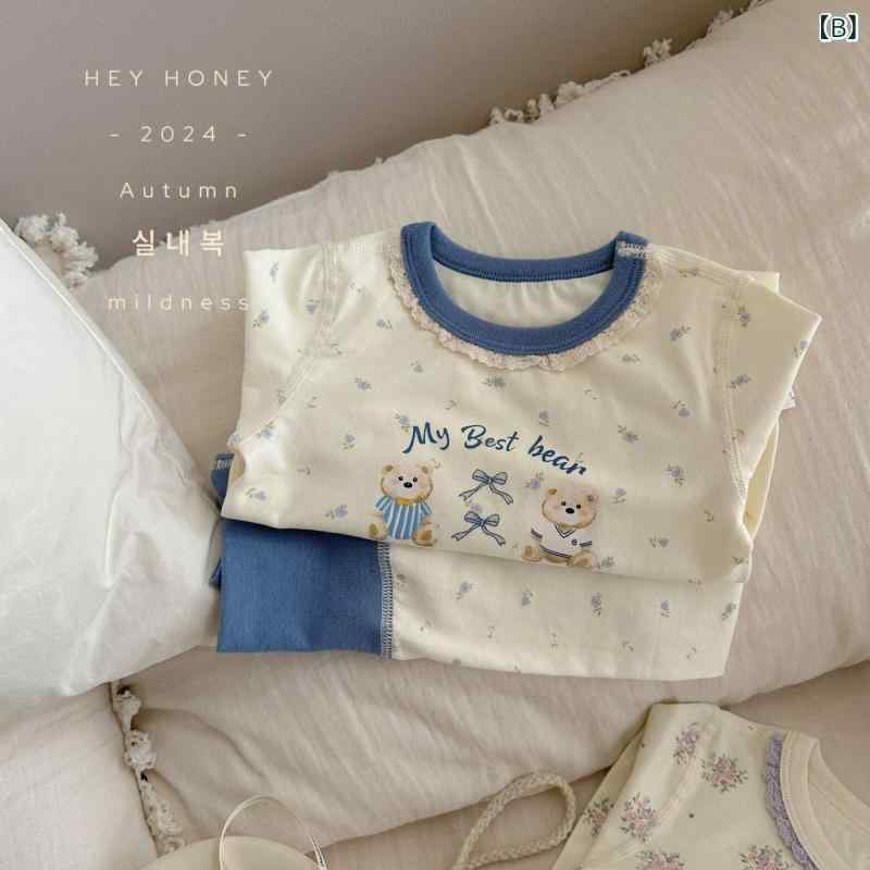 子供用パジャマ 秋冬 ベビー 高腰 長袖 コットン 上下セット 男女兼用 80 85 90 100cm ブルー パープル 花柄 小熊柄 伸縮性