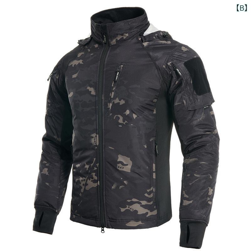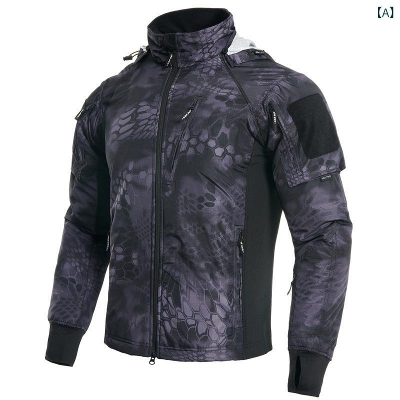 マウンテンパーカー メンズ 男性用 迷彩 ジャケット アウター 秋冬 防風 防寒 登山 釣り ウェア アウトドアウェア 薄手 軽量 取り外し可能フード付き ポリエステル ブラック系 グリーン系