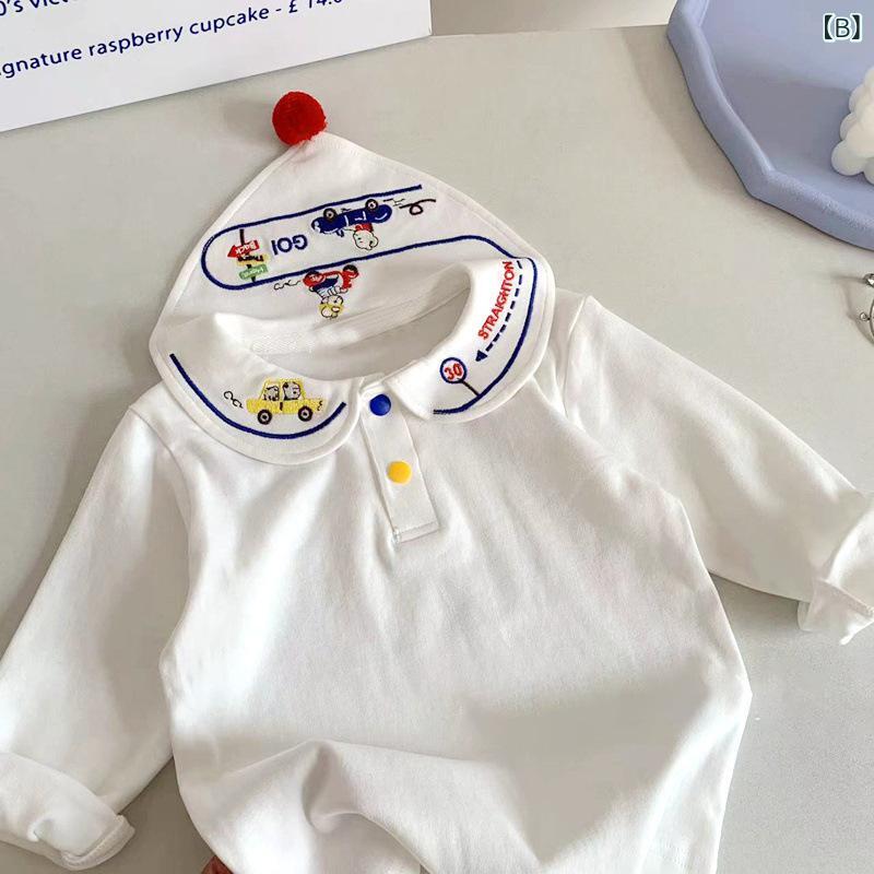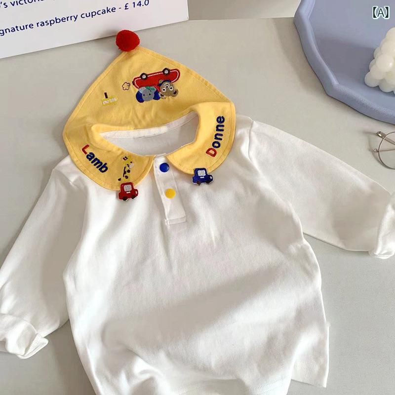 ・カテゴリ: Tシャツ・スタイル: カートゥーン・対象: 男女兼用・袖丈: 長袖・対象年齢: 1~3歳 (80~100cm)・シーズン: 春秋・柄: カートゥーン・素材: 綿・素材構成: 綿96~100%・ネックライン: 襟付き・機能: 吸湿・カラー: 黄色襟, 白色襟・サイズ: 80cm, 90cm, 100cm, 110cm, 120cm