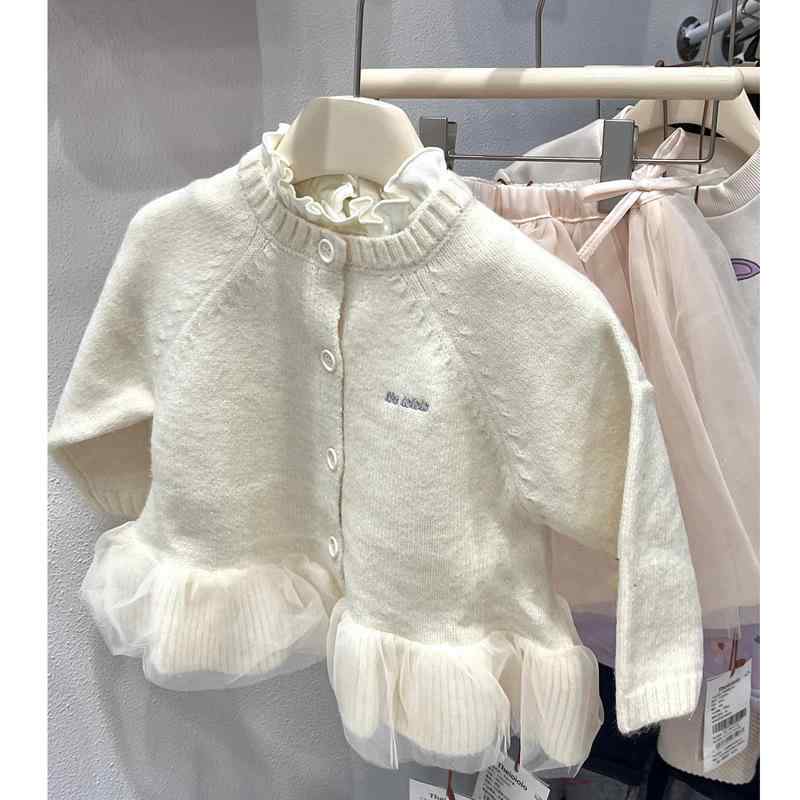 子供服 ニット カーディガン 女の子 2024年 秋冬 長袖 丸首 コットン 刺繡 網紗 切り替え かわいい おしゃれ ミルクホワイト 80cm 90cm 100cm 110cm 120cm 130cm 140cm 150cm