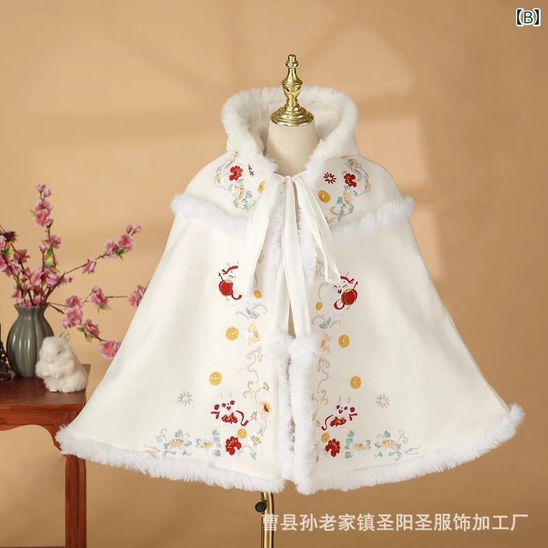 キッズ ポンチョ 女の子 ウサギ 刺繍 ショール 厚手 ケープ 中国風 古装 お正月 防寒着 秋冬 赤 白 110cm 120cm 130cm 140cm 150cm 160cm