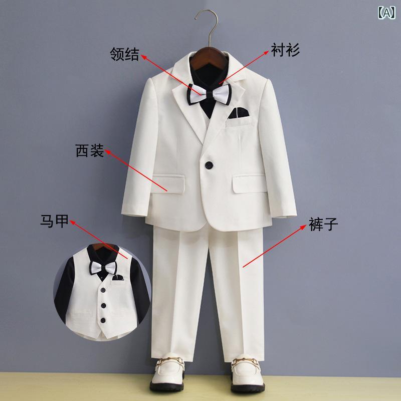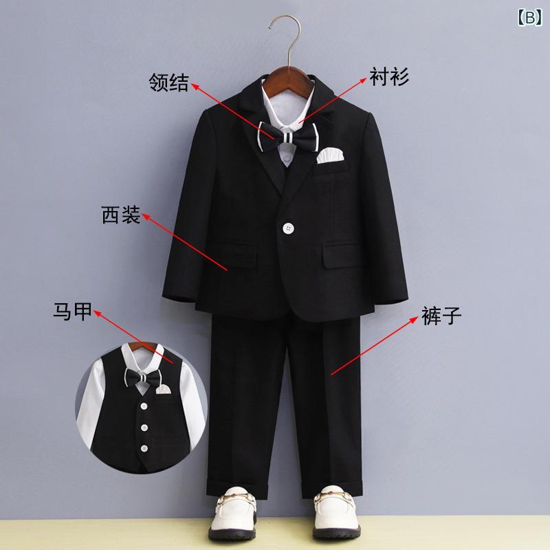 子供用フォーマルスーツ 男の子 ジャケット ベスト パンツ 長袖シャツ 蝶ネクタイ付き 結婚式 発表会 舞台衣装 90cm~170cm ポリエステル 混紡 ホワイト ブラック
