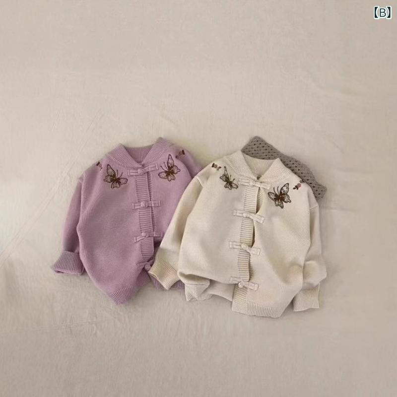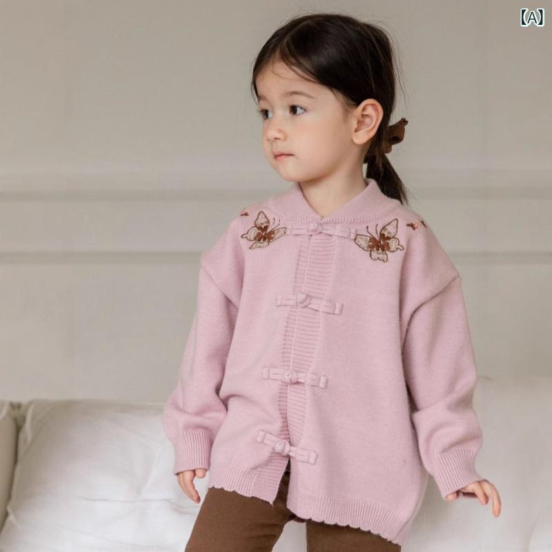 ニット・セーター ガールズ 子供服 カーディガン 春秋 刺繍 蝶 Vネック チャイナ風 レトロ ニット トップス