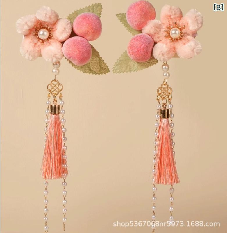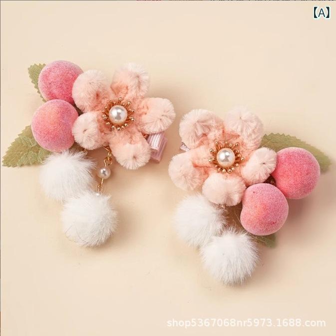ヘアピン 子供用 ヘアアクセサリー 古風 中国風 新年 桃 ベルベット 花飾り かわいい 赤 ピンク