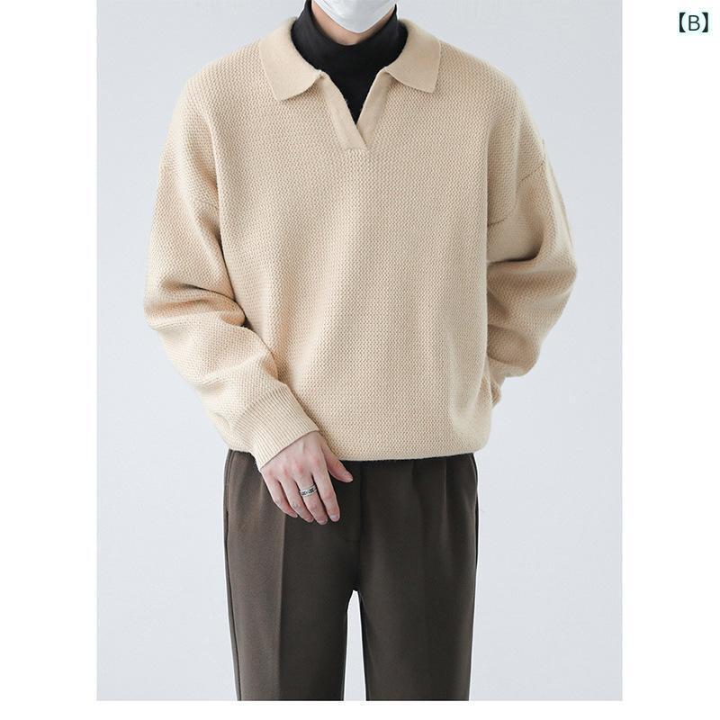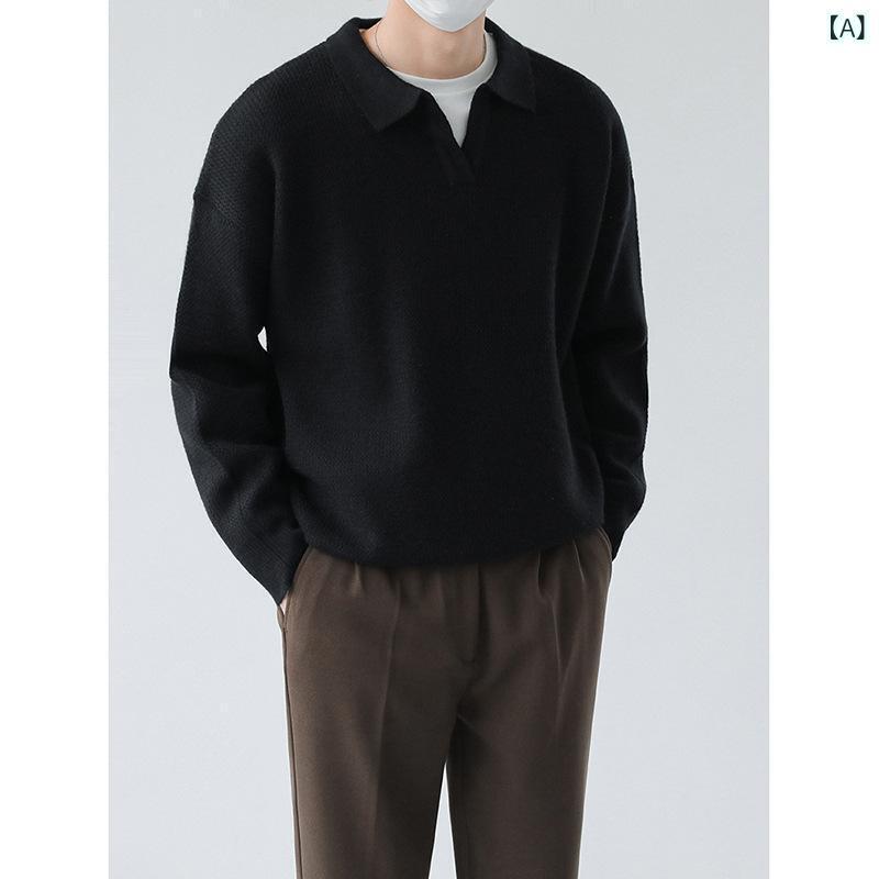 ニット メンズ ニットポロシャツ 秋冬 リブ 襟付き 長袖 プルオーバー ポリエステル 無地 黒 ブラック 杏色 ベージュ グレー ブラウン 普段使い 部屋着