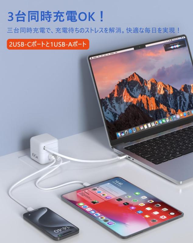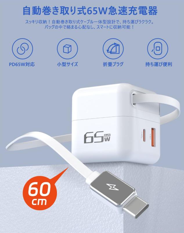 巻き取り式充電器 type-c 65W usb-c充電器 PD3.0対応 巻き取り式充電ケーブル タイプc 折りたたみ式プラグ GaN採用 コンパクト 対応iPhone16/15/14/Android MacbookなどノートPC/マートフォン/タブレットそ【3IN1自動巻き取りUSB充電器】高の充電環境を構築しようと巻き取り式ケーブル搭載の65W USB-C 充電器を導入充電中は瞬時にケーブルを取り出せ、完了後はわずか1秒でスムーズに収納可能です。無段階調節により最大60cmまで自在に延長でき、スマートフォンやタブレットなど多彩なデバイスに対応します。旅行先、オフィス、出張先でも、コンパクトで洗練されたデザインと優れた使いやすさを実感できます。(注: ケーブルを引き出した後は、ケーブルをさらに1cmゆっくりと伸ばすことで巻き取ることができます。)【PD3.0/65W 超高速充電】 外出前や急ぎの際にバッテリー切れ?そんな時にぴったりの高速充電長さを自由に調整できるの自動巻き取り式 65W 急速充電器はPD3.0技術を搭載し、最大65Wの出力でスマートフォン、タブレット、PCなど、Type-C対応のあらゆるデバイスを急速充電できます。C1およびC2ポートで最大65Wの出力をサポートしており、30分でMacBook Air M2を51%、iPhone 16を60%まで充電可能です。毎日の充電時間を大幅に短縮し、常にフルパワーでお客様のデジタルライフをサポートします【3台同時充電OK】当社の3IN1充電器は、2つのUSB-Cポートと1つのUSB-Aポートの計3ポートを備えており、パソコン、スマートフォン、タブレットなど、最大3台のデバイスを同時に充電できます。高出力で急速充電をサポートし、充電待ちのストレスを軽減します。家庭やオフィス、旅行先でも、シンプルなデザインが充電環境をすっきり整え、ケーブルの混雑も回避できます。多様なシーンで活躍する頼れる一台です。【抜群の互換性&多重保護システム】当社のタイプC充電器は、iPhone、Android、タブレット、ノートPCなど、PD対応機器なら何でも急速充電できます。さらに、100Vから240Vまでの広い電圧に対応しており、日本、アメリカ、中国など、さまざまな国で安心して使用できます。多重保護システムとして、短絡保護、電流制御、過電圧保護、過電流保護、過熱保護など、各種保護機能を搭載しています。これにより、長時間使用しても安定した性能を維持し、大切なデバイスを確実に守ります。【GaN窒化ガリウム&持ち運びに便利な設計】当社の65W PD充電器は、次世代GaN(窒化ガリウム)技術を採用し、高出力と小型軽量化を実現しています。コンパクトなサイズは50×50×52 mm、重さはわずか169gで、出張や旅行時の携帯に適した設計です。さらに、折りたたみ式プラグや磁気吸着ポートを搭載しており、調整自在の巻き取り式充電ケーブルなので、もうバッグの中でケーブルが絡まることはありません。