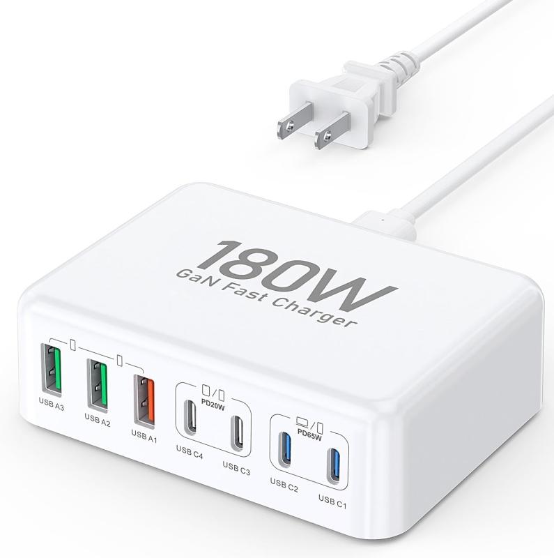 180W iPhone 急速充電器 7ポート MacBook MAC充電器 超軽量 Type-C USB コンセントタイプC PD3.0/QC3.0規格 PSE認証 新生代GaN iPad/iPhone/Android/MacBookなど多機種対応 (白)