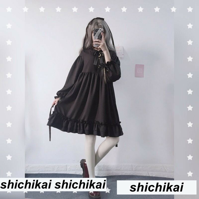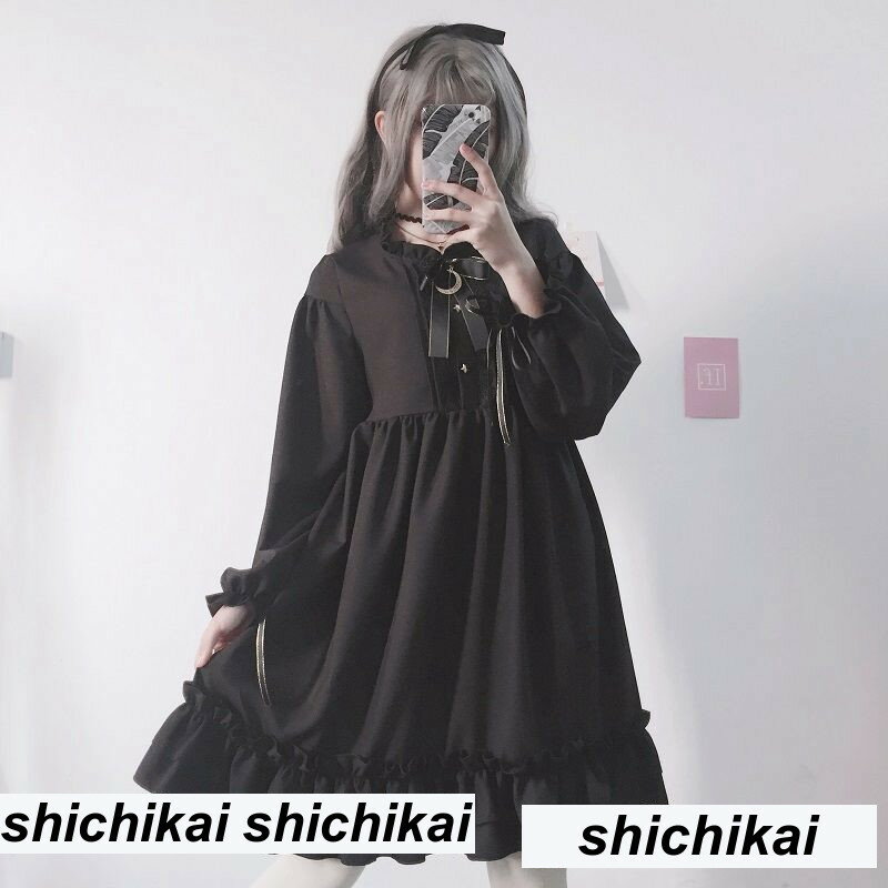 ワンピース ゴスロリ ロリータ ワンピース フリル Lolita ワンピース お嬢様 膝丈 長袖 森ガール 洋服 ドレス ゆったり きれいめ 少女 原宿系 通学 可愛い イベント衣装 学園祭 春秋 仮装 パーティ お花見 ブラック