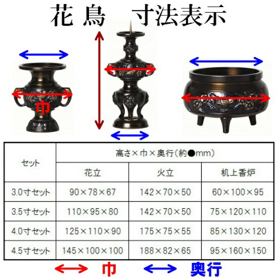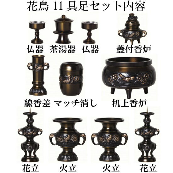 ※商品名【花鳥 11具足 ●寸】の●寸とは、「花立の高さ」を基準に表示したものです。 ※セット内容の各仏具の寸法は、画像の「寸法表示」3.0寸セットをご参照くださいませ。 ※「蓋付香炉」は、お香を焚いたり、お焼香に用いたりします。なお、お線香を焚くときには「机上香炉」をお使い下さい。 【蓋付香炉(上香炉)サイズ】 3寸・3.5寸セット用・・・巾 約 8 cm 4寸セット用・・・巾 約 9.3 cm 4.5寸セット用・・・巾 約 9.5 cm ※真鍮製(色付)海外製 ※「使用例」画像は「花鳥6具足」を使用した場合のもとなります。[送料無料]◆真鍮製色付き仏具:机上香炉・蓋付香炉・花立×2・火立×2・仏器×2・茶湯器・線香差・マッチ消しの11点セットです 唐木仏壇・金仏壇にいかがですか?