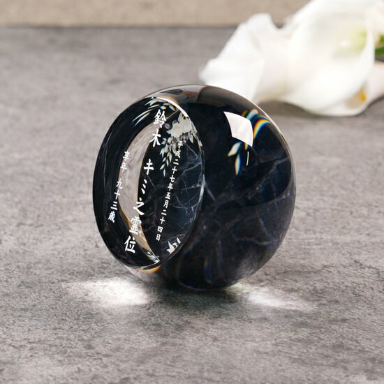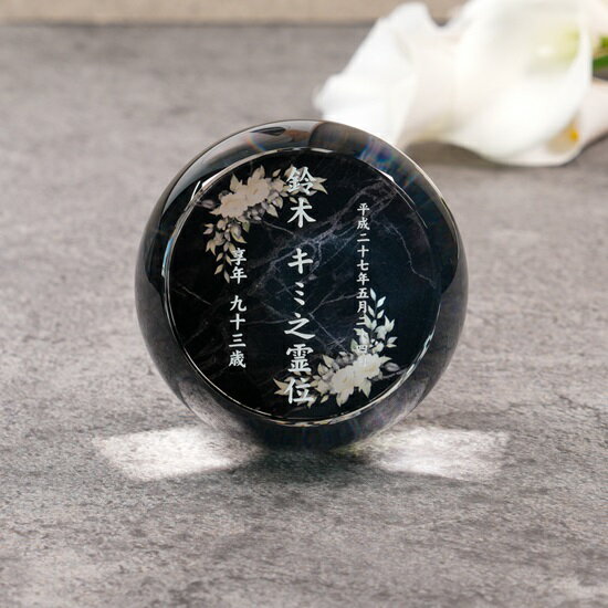 [本体サイズ]:商品画像をご参照下さい。 [材質]:クリスタルガラス ※有害な鉛成分を一切含まずに従来のクリスタルガラスと同等の透明度と輝きを実現した地球環境に優しいエコロジークリスタルガラスを使用。 ※表面に傷が付きにくい為、長期間に渡り抜群の美しさと透明度が持続します。 ※熟練の職人が1点1点手作業でカット・研磨しております。 [文字加工]サンドブラスト彫刻加工 ※ガラス表面に直接文字を彫刻します。 [テンプレート加工]フルカラー印刷加工 ※最先端のダイレクト印刷機を使用し、クリスタル表面に直接印刷します。 ※印刷部分は強くこすったり、アルコールがかかるとはがれる可能性がございますのでご注意ください。 【ご注文時の注意】 (1)すべての選択項目(プルダウン)をお選び下さい。 (2)戒名・没年月日・没年齢など位牌に刻む文字内容は、ご寺院様にご確認の上、備考欄に必ず記入して下さい。 (3)戒名の下の「位」、没年月日の下の「没や寂など」、没年齢の上の「行年・享年」・下の「歳や才」なども、ご寺院様にご確認の上、お知らせ下さい。 (4)位牌作成の前に、弊社より「レイアウト図(完成予想図)」を作成しお知らせ致します。お客様より確認をいただけ次第、ご注文商品の製作に入ります。 (5)「文字の色入れ(有料オプション)」をご希望のお客様には、ご注文後、追加料金分を修正して弊社より再度メールにてお知らせいたします。穏花 クリスタル位牌:淡くナチュラルなニュアンスカラーのフラワー柄や重厚な大理石柄と彫刻を引き立てる金銀の着色を組み合わせた美しいお位牌です。 ◆KH-27:円形の柔らかいフォルムが美しいお位牌です。 ◆お手入れも柔らかい布で拭くだけと非常に簡単で、最近主流の家具調のお仏壇にもよくマッチし、心癒される空間が広がります。