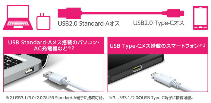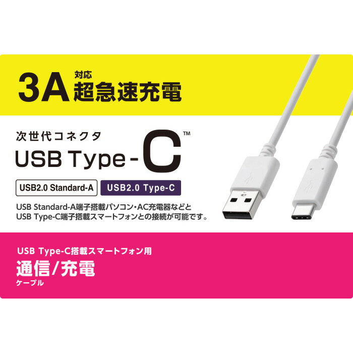 USB Type-C搭載スマホ・タブレットに充電・データ転送できるUSB2.0ケーブル【特徴】■USB Type-C搭載スマホ・タブレットに充電・データ転送できるUSB2.0ケーブルUSB Standard-Aを搭載しているパソコン及び充電器、モバイルバッテリーなどに、USB Type-Cを搭載しているスマートフォンやタブレットを接続し、充電やデータ転送ができるUSB2.0ケーブルです。■Certified Hi-Speed USB正規認証USB2.0の規格である「Certified Hi-Speed USB(USB2.0)」の正規認証品です。■ウラ、オモテに関係なく挿し込める新規格のUSB Type-Cコネクタは、ウラ、オモテに関係なく両面挿せます。■大電流で充電が可能最最大15W(5V/3A)の大電流で接続機器の充電が可能です。【詳細情報】コネクタ形状 USB2.0 Standard-Aオス-USB Type-Cオス対応機種 USB Standard-A端子搭載のパソコン・充電器・モバイルバッテリーおよび、USB Type-C端子搭載のスマートフォン・タブレットなどケーブル太さ 3.2mm規格 USB2.0規格正規認証品対応転送速度 最大480Mbps ※理論値パワーデリバリー対応 ×プラグメッキ仕様 金メッキピンシールド方法 2重シールドツイストペアケーブル(通信線) ○カラー ブラックパッケージ形態 PET箱+紙台紙JANコード:4953103497337