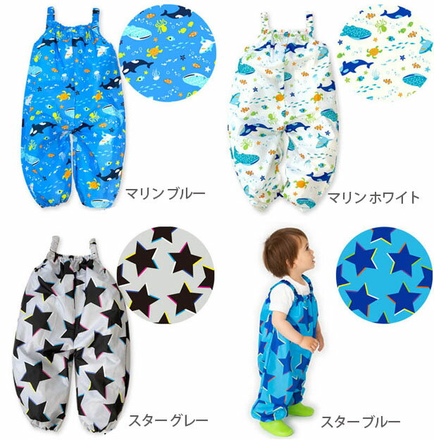 【砂場着】 プレイウェア for baby boy【 ベビー 赤ちゃん 男の子 レイングッズ 砂場着 遊び着 水遊び 撥水 レインパンツ オーバーオール 90cm 100cm かわいい 宇宙 恐竜 水族館 魚 ネイビー 黒 白 グレー 】 sps