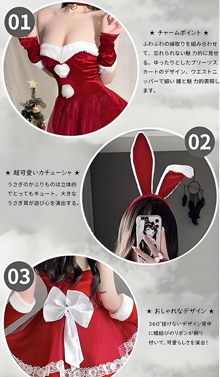 商品名:ワンピース サンタコス クリスマス 赤 ピンク かわいい サンタクロース シンプル コス 衣装 仮装 レディース 忘年会 大人 女性 コスチューム パーティー イベント 兎耳 ウサギ カチューシャ 4点セット 【可愛らしいサンタの装い】このワンピースサンタコスは、クリスマスや忘年会にぴったりな可愛い衣装です。赤とピンクのカラーリングが魅力的で、大人の女性に最適なシンプルでありながら個性的なデザインが特徴です!ウサギの兎耳カチューシャもセットになっており、一層キュートさを引き立てます。 【多彩なシーンで活躍】クリスマスパーティー、仮装イベント、女子会など、幅広いシーンで大活躍!お友達や同僚と揃えて着ることで、楽しい思い出を作れること間違いなしです。友人たちの視線を釘付けにすることができる、特別なコスチュームです。 セット内容: 兎耳+ワンピース+袖カバー+首飾り 注意事項: ※サイズは測り方により、1cm~2cm誤差が生じる場合がございます。 ※お客様のモニター環境により実物の色合いと若干お色目が異なる場合がございます。 ※モデルに使用している小物やアクセサリー等はセット内容に含まれておりません。