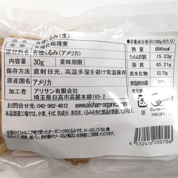 有機くるみ(生) ジッパー付き袋(30g)【アリサン】