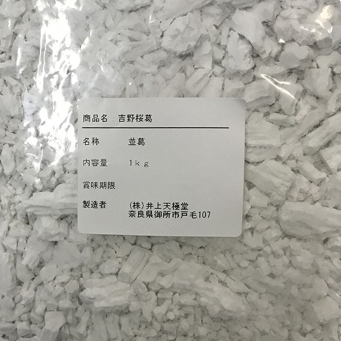 吉野桜葛 1kg 株式会社井上天極堂の業務用並葛です。 胡麻豆腐やあんかけ料理など幅広くお使いいただけます。 ※入荷状況によりパッケージデザインが変更の場合がございます。あらかじめご了承ください。 ■まとめ買い、在庫、納期、賞味期限などの商品に関するご質問がございましたらお気軽にお問合せください。 商品詳細 商品名(名称) 井上天極堂 業務用 吉野桜葛 原材料名 甘藷澱粉(さつまいも(国産)) 内容量 1kg 賞味期限 商品ラベル・又は枠外に記載 保存方法 高温多湿を避け常温で保存 製造者 株式会社井上天極堂 栄養成分表示(100g当り推定値) 熱量 332kcal、たんぱく質 0.1g、脂質 0.2g、炭水化物 82.0g、食塩相当量 0g 発送方法 常温便 同梱不可 冷蔵・冷凍の商品との同梱はできません。