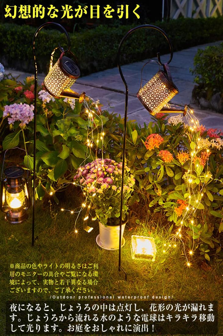 スタイル:装饰艺术◆商品名:ソーラーじょうろライト 2個セット スタンド付 ジョウロ ガーデンライト 自動点灯 電球色 屋外 防水 装飾用 ソーラーライト ソーラーランタン 置物ライト LEDライト 配線不要 おしゃれ 日本語説明書付【幻想的な光が目を引く】夜になると、じょうろの中は点灯し、花形の光が漏れます。じょうろから流れる水のような電球はキラキラ移動して光ります。さらに、水の部分のライトは自由に形を変えることができるので、場所と気分で変えられます。【省エネ】2V 100mAの多結晶シリコンソーラーパネルを採用、スイッチをONにセットしてから、直射日光の当たる場所に置くだけで充電でき、電気代はゼロです。600mAhの大容量ソーラー充電電池が内蔵、8~10時間充電すると、6~8時間照明できます。【自動点灯・消灯】光センサー内蔵で、周囲環境の光度を感知でき、暗闇や夜間に自動的に点灯し、昼間や明るい場所では自動的に消灯になりますので、操作する必要はありません。【防塵・防水性能抜群】防塵・防水保護等級はIP44に達しており、防塵・防水性能に優れています。ガーデンや芝生など屋外の場所に設置してもしっかりと保護してくれるので安心です。【取付簡単】直射日光の当たる芝生に差し込むだけでご利用いただけます。面倒な配線は不要なので、設置場所を変えたりするときに困らず、お庭の外観も損ねません。スタンドを使わずに、使いたい場所に吊り下げたり、置いたりするなど用途は様々です!