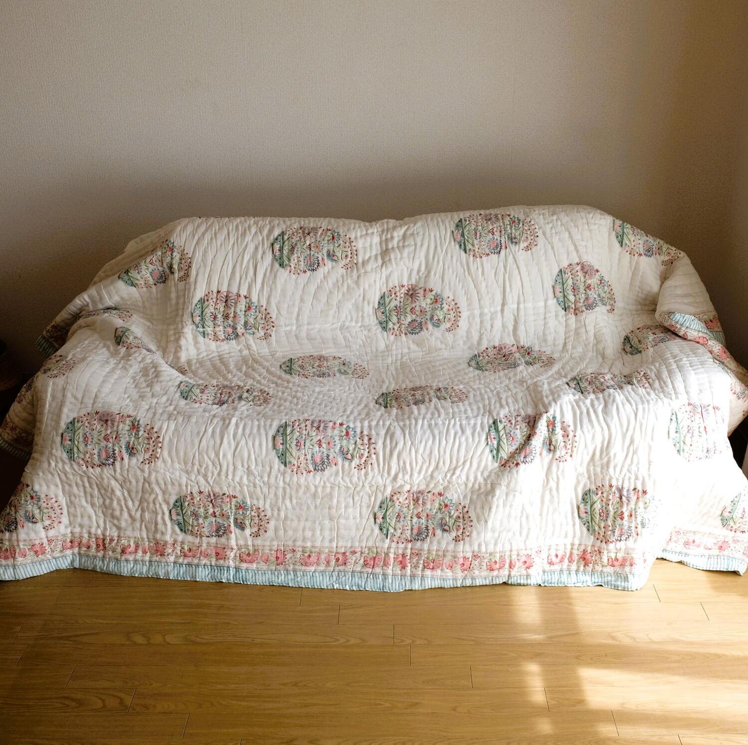 商品情報素材/材質綿100%サイズ/寸法約 230 x 260 cm注意洗濯機で丸洗いが出来ますが、色落ちや色移りすることがありますので、ネットに入れて単独で洗うことをおすすめしております。洗濯後は早めに形を整えて陰干しで乾かすようにしてください。強い日光の下で長時間干すと色褪せの原因となりますのでご注意ください。画像は出来るだけ色形など現物に近い状態で処理しておりますが、ブラウザやモニタの違いによって色の見え方が異なります。インドの職人がハンドメイドでひとつひとつお作りしたものです。そのため、柄や色の濃淡の差、また染ムラ、若干のシミやほつれなどが見られる場合がございます。こちらはハンドメイドの特徴としてご了承ください。生産国インドキルト ブランケット インド綿 ブロックプリント ダブルサイズ ホワイト/グリーン/レッド230x260cm おしゃれ かわいい ブランケット 花柄 キルトブランケット 中綿キルト エシカル ハンドメイド インド雑貨 アジア雑貨 ボタニカル ダブルベッドサイズ ブロックプリント布で出来た中綿入りキルトブランケット ダブルサイズのベッドスプレッドに インド・ジャイプールの伝統的な染色・印刷技術であるブロックプリントの綿布を重ね合わせ、中綿を詰めて縫い合わせたキルトのブランケットです。表地、裏地、中綿もお肌に優しい綿100%で作っているので敏感肌の方やお子様も安心してお使いいただけます。ジャイプール地域のブロックプリントは花柄や植物のモチーフを用いた華やかな柄が多いのが特徴、ハンドメイドならではのかすれやにじみの風合いも魅力で、お部屋をいっそう華やいだ雰囲気にしてくれます。ひざ掛け、ブランケット、ベッドカバーなどにおすすめです。【ブロックプリント】手彫りの木版にインクを塗ってハンコのように押すことを繰り返し、一枚の鮮やかな模様の布を作り上げるインドの伝統的な印刷技術です。その歴史は古く、インダス文明まで遡るともいわれます。一柄ずつ、一色ずつ重ねて押していくことでカラフルで精巧な美しいデザインが出来上がります。機械印刷にはない優しい風合いが魅力です。 5