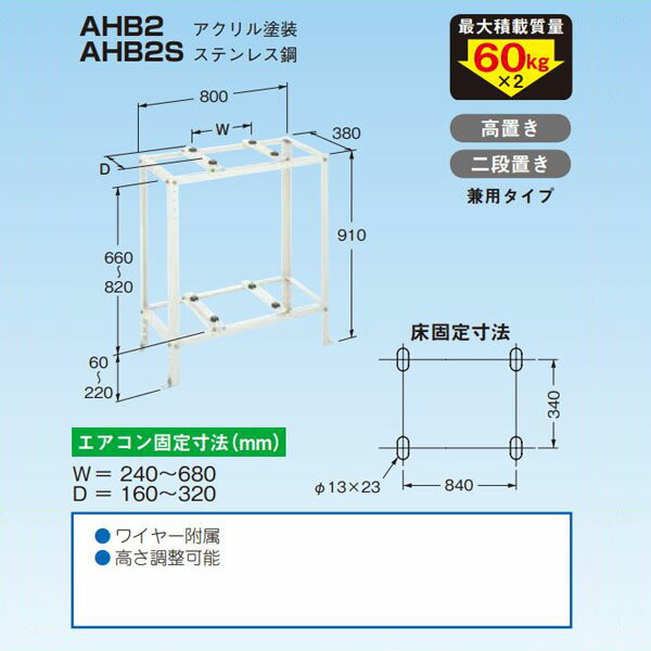 商品詳細製造ネグロス電工品番AHB2S仕様種類:ステンレス鋼室外機固定寸法:W240-680 D160-320室外機重量:60kg以下×2寸法:W800 D380 H910入数:1