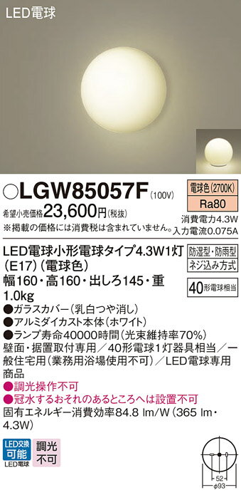 エクステリア 屋外 照明 ライト パナソニック(Panasonic) ポーチライト LGW85057F ホワイト 電球色 壁直付型・据置取付型LED(電球色) ポーチライト・浴室灯 防湿型・防雨型 白熱電球40形1灯器具相当