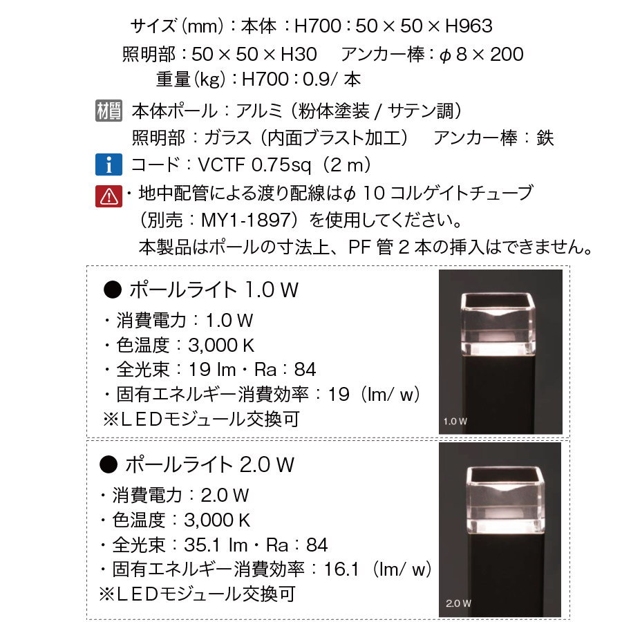 商 品 詳 細商品名オンリーワンクラブ プリモ ポールライト スクエアスリム床面照射タイプ H400・2Wお徳用 2本 ブラウン MY1-3265 サイズ本体(ポール):50×50×H663 照明部:50×50×H30 アンカー棒:φ8×200重量(kg)1.34kg/本材質本体(ポール):アルミ(粉体塗装/サテン調) 照明部:ガラス(内面ブラスト加工) アンカー棒:鉄仕様仕様1:コード:VCTF0.75sq(2m) 仕様2:LED:電球色 消費電力:2W 仕様3:全光束:35.1 lm 仕様4:固有エネルギー消費効率:16.1 lm/w 仕様5:色温度:3000K 演色:Ra84 仕様6:LEDモジュール交換可備考※沖縄・離島は別途送料がかかります。事前にお問い合わせ下さい。 ※メーカー直送のため、代引き支払いできません。 ※12V専用 中国製補足事項●この器具には+と−の極性があります。極性を間違えて接続すると器具の破損・火災の原因となります。 ●この器具は耐塩仕様ではありません。塩害地域で使用しますと早期に錆や腐食などが発生し、火災・感電・落下の原因となります。禁止事項※低電圧仕様の屋外専用ガーデンライトです。火災や停電・落下・器具破損の原因となりますので、一般通常環境以外の場所、浴室、サウナ風呂、水がたまる場所や湿気の多いところ、海岸隣接地などでは使用しないでください。 ※地面差込専用器具です。火災、転倒の原因となりますので、垂直に設置ができないところや安定した設置ができないところ、水に浸るところ等指定場所以外には取り付けないでください。 ケーブルをそのままコンクリートへ埋めないでください。(電線保護管による配管施工をしてください)故障の原因となります。 ※点灯には専用トランスを使用し、その接続容量を超えないように確実に接続してください。接続容量を超えて設置したり、接続に不備があると火災の原因となります。 ※火気等の近くでは使用しないでください。火災・感電・落下の原因となります。 ※器具にその他の荷重をかけたり、布や紙等の可燃物で覆わないでください。火災・感電・落下の原因となります。 ※器具の改造部品を変更して使用しないでください。火災・感電・落下・転倒等の原因になります。注意事項※説明書に従って施工してください。施工に不備があると、火災・感電・落下・転倒の原因となります。 ※電源接続の際は説明書に従い確実に行ってください。接続が不十分な場合、接触不良により火災の原因となります。 ※電源電圧は、本説明書に記載されている定格電圧でご使用ください。過電圧を加えるとLED寿命が短くなるほか、部品が過熱し火災・感電の原因となります。 ※万一煙・臭い等の異常を感じたら、すぐに電源を切ってください。火災・感電の原因となります。異常がおさまったことを確認したのち、工事店・お買い上げの販売店にご相談ください。 ※電源コードやケーブルが痛んだら使用をやめ、業者に修理を依頼してください。コードやケーブルが破損し、火災や感電の原因となります。 ※製品には寿命があります。外観が正常でも内部の劣化は進行しています。進行度合いは使用条件・設置場所の環境で大きく異なりますので定期的に商品の外観・動作のご確認をお願い致します。点検せずに使用するとまれに火災や感電・落下などにいたる場合があります。 ※施工・電気工事は専門業者にご依頼ください。 ※イメージ画像は使用するブラウザ・モニターにより色が違って見える場合があります。施工について※施工はお客様にて責任を持ってご手配ください。 ※施工には、専門的な知識と、工具、技術が必要となります。 ※お近くの施工業者様に設置を依頼して頂くようお願い致します。 ※お近くの施工業者様に相談の上、設置を依頼して頂くようお願い致します。お庭に設置する屋外商品を多数取り揃えております。欲しい商品を見つけやすいよう様々な検索方法をご用意しております。 メーカー検索やカテゴリ検索で選べるエクステリア商品がいっぱい!ご不明な点がございましたらお気軽にお問い合わせください。↓↓まずは当店人気ランキングをチェック↓↓ ★当店人気ランキングはこちらから ●関連商品 オンリーワンクラブ プリモ ポールライト スクエアスリム床面照射タイプ H400・2W 1本 シルバー MY1-3244 25,500円オンリーワンクラブ プリモ ポールライト スクエアスリム床面照射タイプ H400・2W 1本 ブラウン MY1-3245 25,500円オンリーワンクラブ プリモ ポールライト スクエアスリム床面照射タイプ H400・2W 1本 アースグリーン MY1-3246 25,500円オンリーワンクラブ プリモ ポールライト スクエアスリム床面照射タイプ H400・2W 1本 オーク MY1-3247 18,000円オンリーワンクラブ プリモ ポールライト スクエアスリム床面照射タイプ H400・2W 1本 ウォールナット MY1-3248 18,000円 オンリーワンクラブ プリモ ポールライト スクエアスリム床面照射タイプ H400・2Wお徳用 2本 シルバー MY1-3264 47,700円オンリーワンクラブ プリモ ポールライト スクエアスリム床面照射タイプ H400・2Wお徳用 2本 ブラウン MY1-3265 47,700円オンリーワンクラブ プ