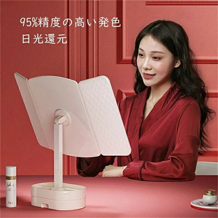 女優ミラー 卓上ミラー 三面鏡 LEDライト付きミラー ライトミラー 卓上鏡 化粧鏡 三色調光 LEDミラー 明るさ調節 タッチボタン 折りたたみ ドレッサー 270度立体鏡 ハイクオリティ