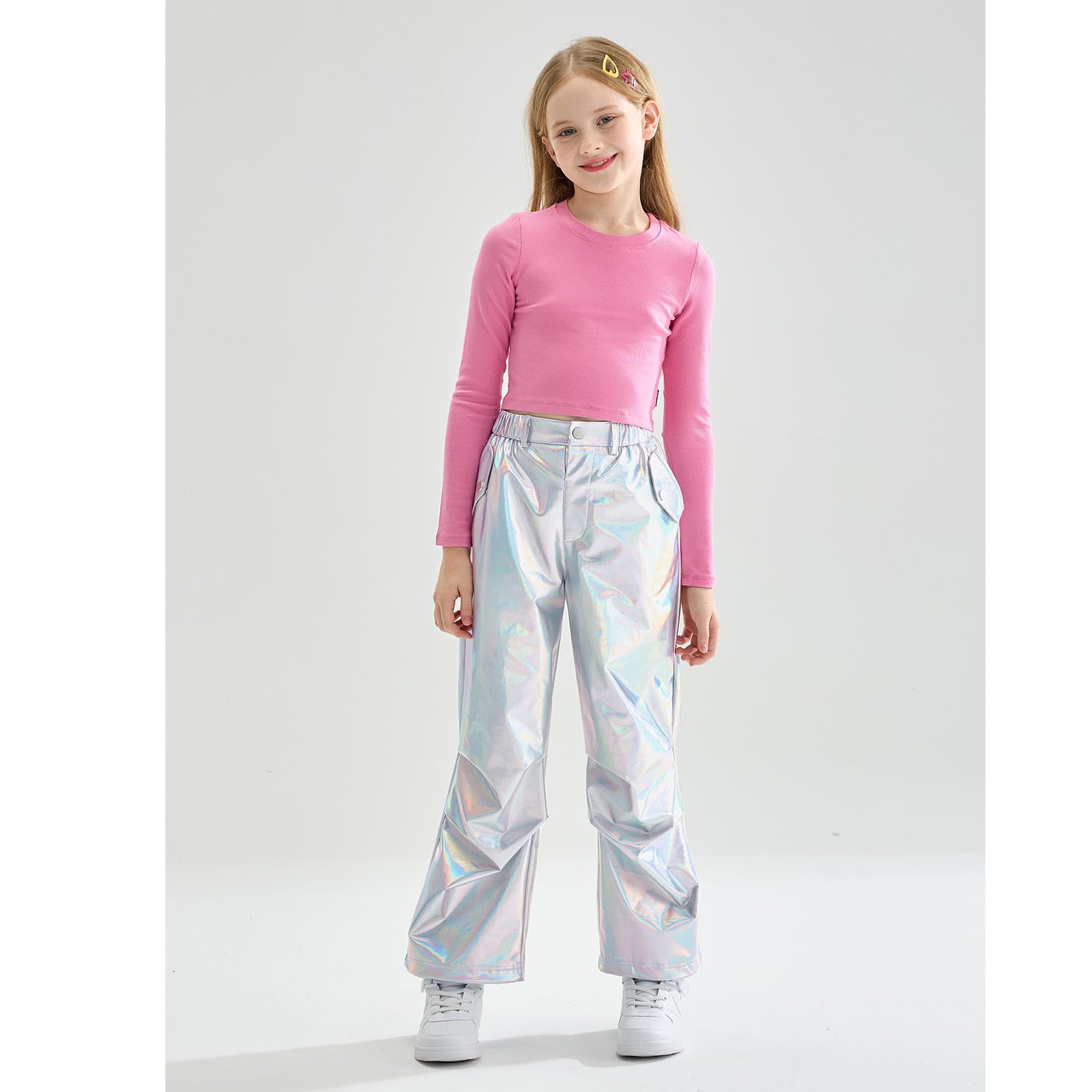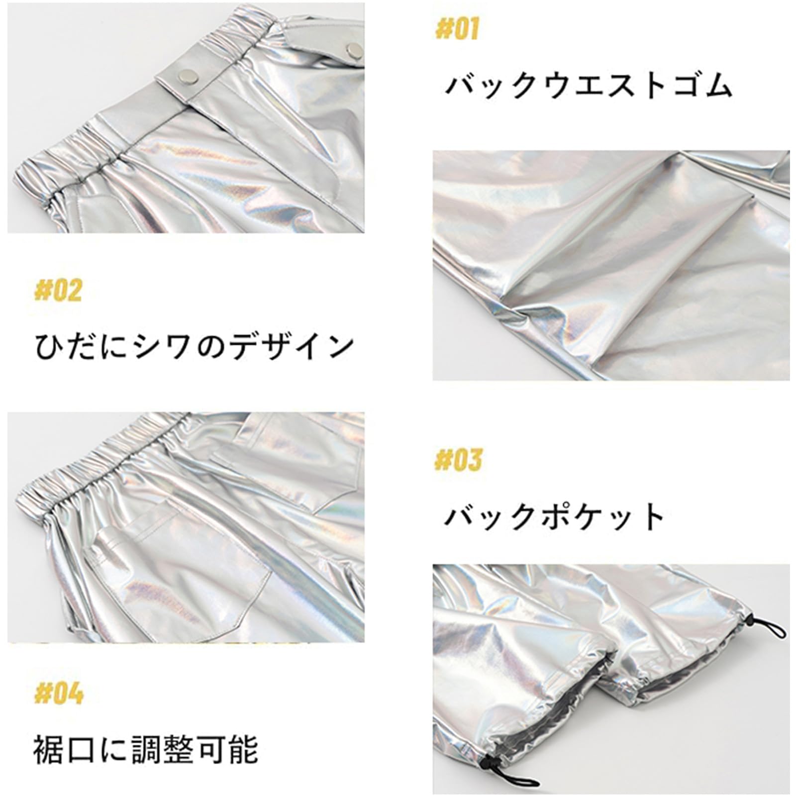 【送料無料】[LOLANTA] ダンス パンツ キッズ ダンス衣装 女の子 ワイドパンツ ロングパンツ カーゴパンツ キラキラ PUレザー おしゃれ 130-170 色:シルバー(Laser silver)、サイズ:130