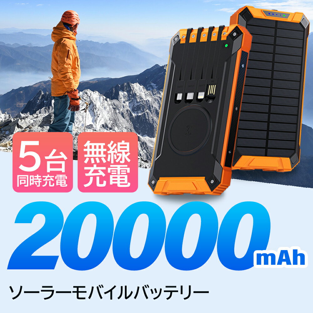 【在庫一掃セール(売り切れ次第終了)】ソーラーモバイルバッテリー 大容量 モバイルバッテリー 20000mAh 急速充電 ソーラーチャージャー 5台同時充電 3本ケーブル内蔵+USBポート IPX7防水 モバイルバッテリー ケーブル内蔵 軽量 薄型 太陽能 充電器 急速充電 緊急停電