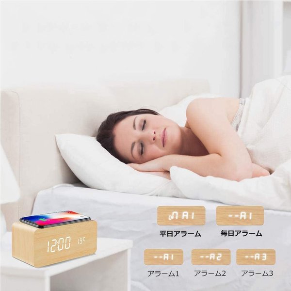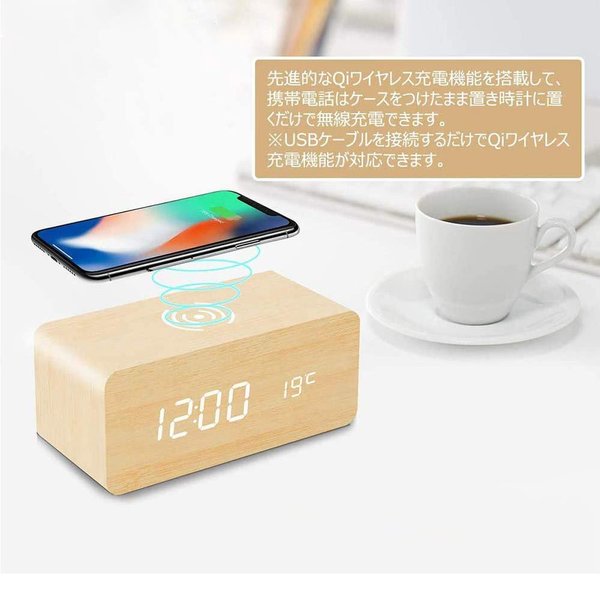 即納 iPhone/Android Qi ワイヤレス充電器 ワイヤレスチャージャー 目覚まし時計 置き時計 木目調/ライトベージュ