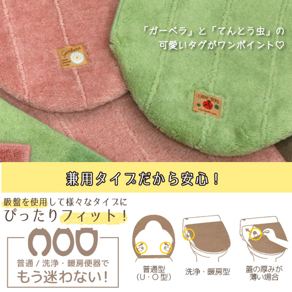 お花畑をイメージした、あたたかで可愛らしいトイレファブリックシリーズ「シャンフル」。 ガーベラとてんとう虫の可愛いタグがワンポイント。 吸盤を使用して様々なタイプのフタにフィットする、兼用タイプのフタカバーです。 ※ドラム式洗濯機は機種によりご使用になれません。 ※乾燥機・アイロンのご使用はお避け下さい。 ※衛生用品のため、返品交換はできかねます。 サイズ等お確かめの上お求めください。 関連商品はこちら ・シャンフルシリーズ一覧 対応型・サイズ ・普通タイプ(O型・U型):フタの縦の長さ+フタの手前の厚みが(約)44cm以下のフタカバー ・洗浄暖房型タイプ:フタの幅42cm以内、フタの縦の長さ+フタの手前の厚みが(約)42〜44cmのもの。 フタの手前が45cm以上のものにも装着できますが、後部端までカバーは掛かりません。 素材・材質 ポリエステル・アクリル キーワード トイレ トイレタリー フタ 蓋 ふた カバー 兼用 O型 U型 洗浄 暖房 ウォシュレット 吸盤 万能 吸着 起毛 洗濯 ナチュラル かわいい おしゃれ シンプル トイレタリー ファブリック グリーン ピンク 黄緑 緑 850270 850287 202102-02