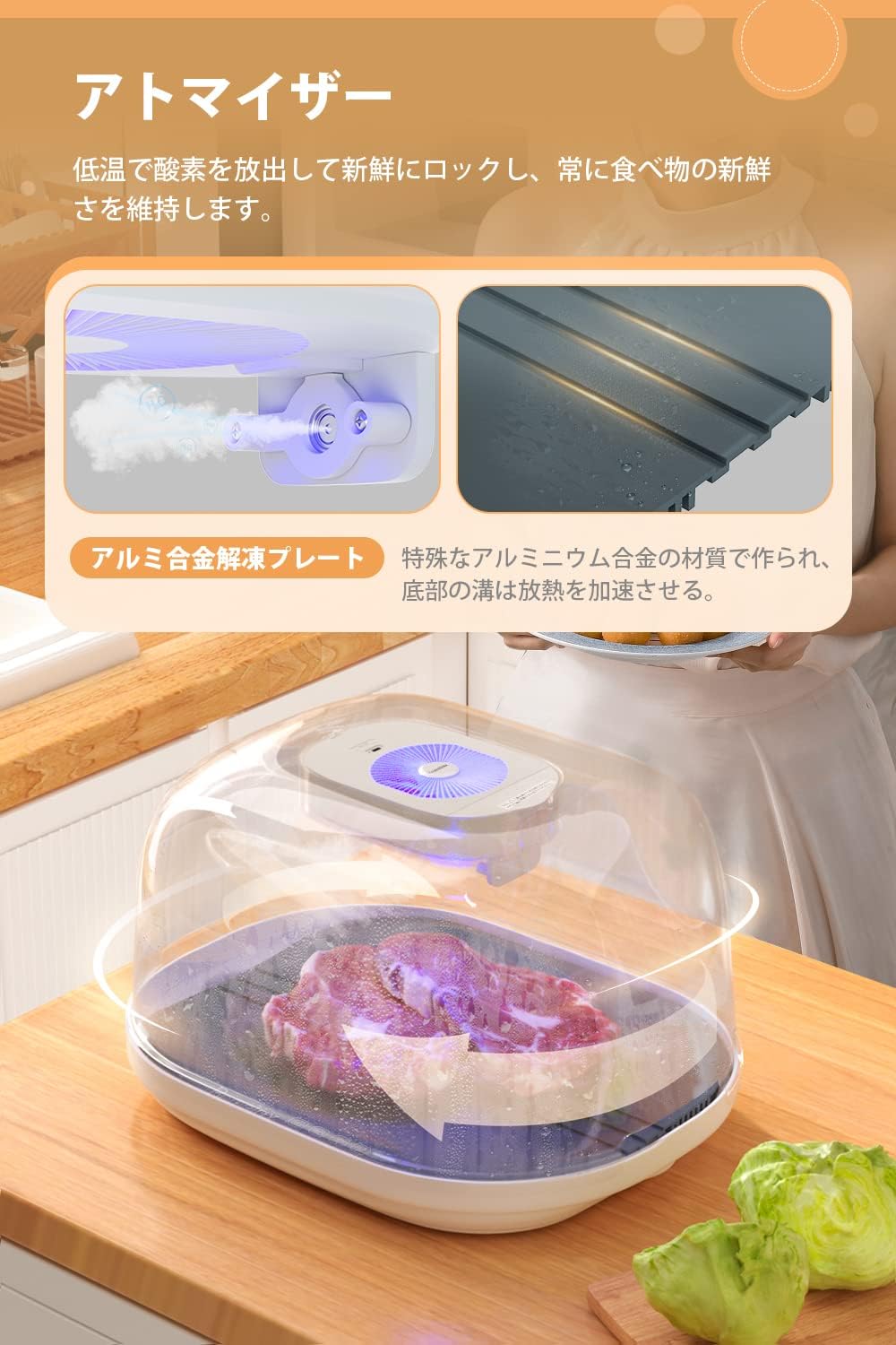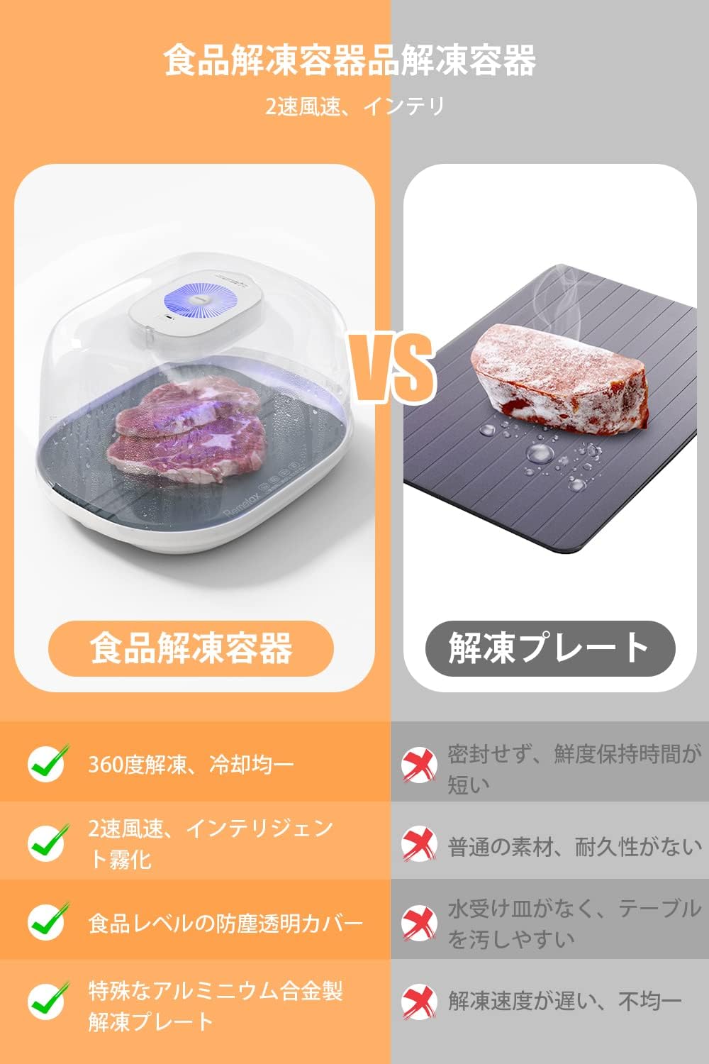 【エコ解凍容器・霧化&急速解凍】超音波アトマイザーを使用して、低温で酸素を放出して鮮度を落とさず、常に食べ物の新鮮さを維持します。また、ファンは空気の流れを速めることができるため、解凍速度が速くなります。霧化と風速による解凍速度が速いため、常温で自然解凍するより短い時間で解凍することができます。細菌の増殖を抑え、栄養素と風味を維持します。 【家庭用食品解凍・食器乾燥機&1台2役】食品の解凍だけでなく、食器や箸の乾燥まで、1台で2つの機能を兼ね備えた製品です。解凍プレートを使用する場合は、アトマイザーとファンをオンにすると、食べ物の解凍に使用することができます。解凍プレートを水切りラックに交換し、ファンをオンにすると、食器の物理乾燥に使うことができます。付属の水切りラックは単独で使用することもでき、野菜や果物などを置けます。使いやすいだけでなく、安全性にも優れています。 【アルミ合金解凍プレート&防塵フタ付き&360度解凍】解凍プレートは特殊なアルミニウム合金の材質で作られ、底部の溝は放熱を加速させる。解凍プレートと食べ物の接触面積が大きいほど、解凍時間は短くなります。透明なフタ付きで、気流を囲むことができ、360度全方位解凍の効果を達成し、解凍速度を速めることができます。また、フタはほこりを防ぎ、食材も衛生的に解凍できるのがいいですね。 【大容量バッテリー&USB充電&お手入れが簡単】1800mAhの電池を搭載し、1回満充電で2〜4時間使用可能です。usb充電式なので、電池交換は不要です。電源に制限されず、シンプルな操作方法とコンパクトな本体で、キッチン、テーブルなど、いつでもどこでも使用可能です。取り外しやすい・お手入れが簡単。軽く押して本体を取り外すだけで、カバー、ベースと解凍プレートを洗うことができます