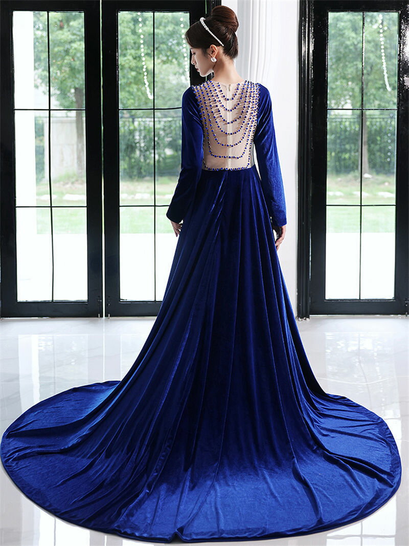ウェディングドレス ウエディングドレス カラードレス ロングドレス サファイアブルー ロイヤルブルー ベルベット 長袖 ロングスリーブ 演奏会 バックシャン 秋冬 スリット イブニングドレス パーティードレス 発表会 結婚式 二次会 披露宴 コンサート 花嫁 カクテルドレス