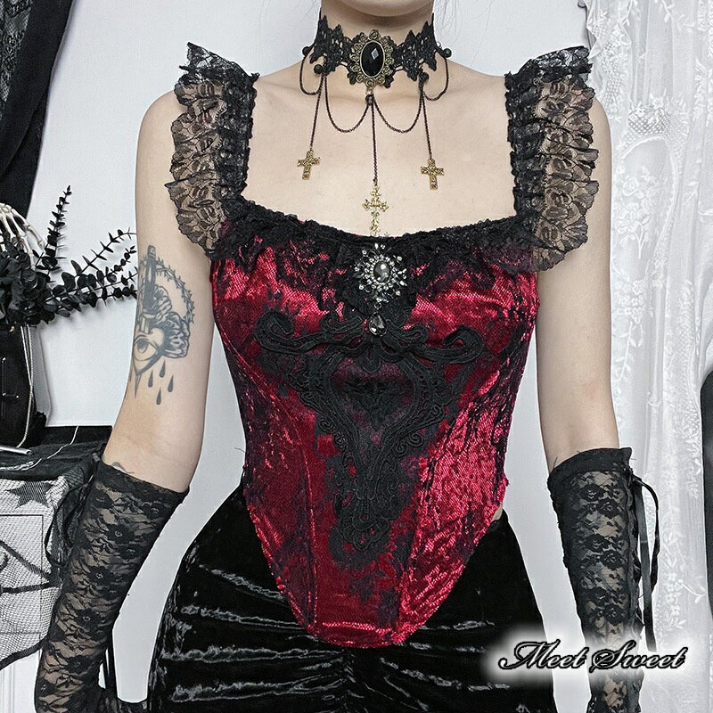 ブラトップ トップス オフショルダー キャミソール ブラウス セクシー ゴシック ベルベット ガードル ゴスロリ ワインレッド 衣装 ハロウィン パンク コスプレ コスチューム ロック 原宿系 大人 レディース V系 地雷系 ビジュアル系 サブカル ライブ衣装 ヴィジュアル系