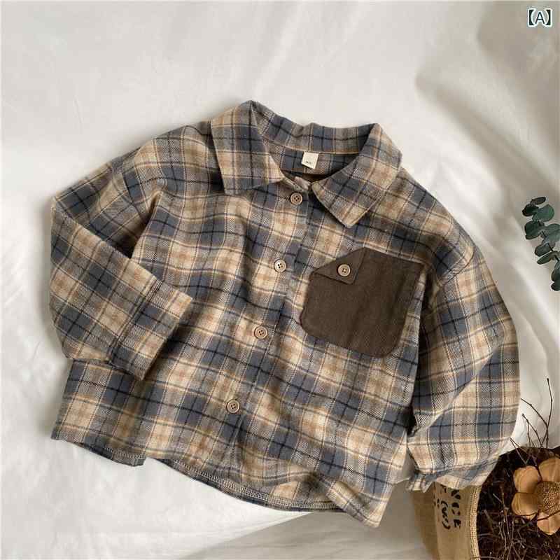 シャツ キッズ 男女兼用 子供服 レトロ 配色 ポケット チェック柄 長袖シャツ 韓国 ゆったり 開襟シャツ 開襟