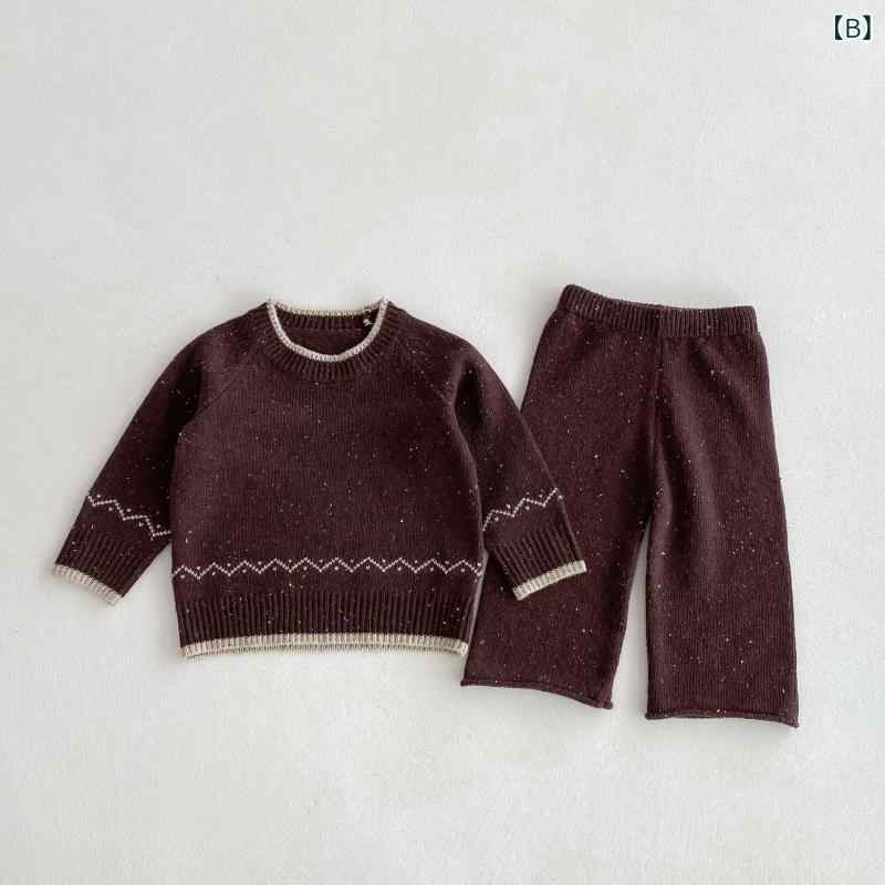 子供服 ニット セットアップ 長袖 プルオーバー セーター 提花 男の子 女の子 秋冬 かわいい 普段使い[ "・適用性別: 男女兼用", "・生地技術: 柔らかく加工", "・スタイル: 韓国版", "・対象年齢: 中小", "・対象年齢(詳細): 3~8歳, 100~140cm", "・適切な季節: 冬, 春, 秋", "・糸の太さ: 普通", "・厚さ: 普通", "・袖丈: 長袖", "・閉鎖スタイル: プルオーバー", "・パターン: 迷彩, ドット", "・実写画像: モデルなし", "・在庫: あり", "・要素: セット, かわいい, トレンド", "・AQLサンプリング基準: 2.5", "・平織りステッチ距離: 12~14針/3cm", "・起毛のトリミング: 全てきれいにトリミング済み", "・生地名: ニット", "・主な生地構成: ポリエステル繊維 (ポリエステル) 40%", "・安全レベル: B", "・襟のタイプ: ラウンドネック", "・フード: フードなし", "・色: ライトアプリコット, レッドコーヒー", "・身長: 80cm, 90cm, 100cm, 110cm, 120cm, 130cm", "・越境輸出専用品: はい", "・前立て: プルオーバー", "・製品カテゴリ: 子供用セーター"]