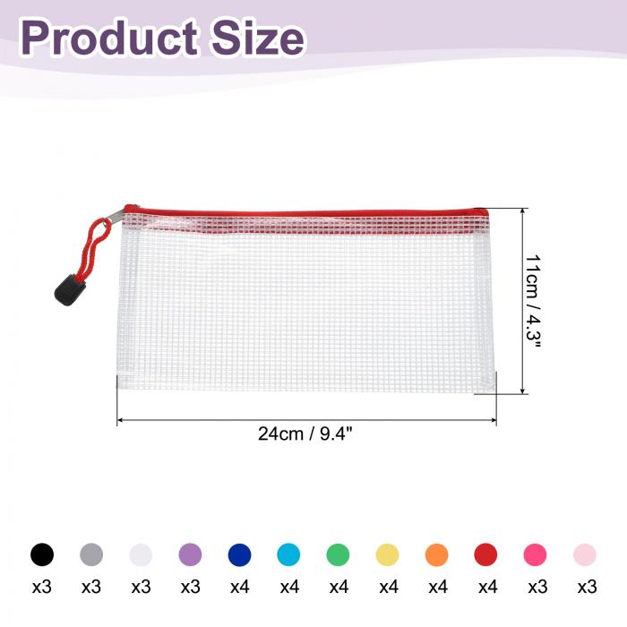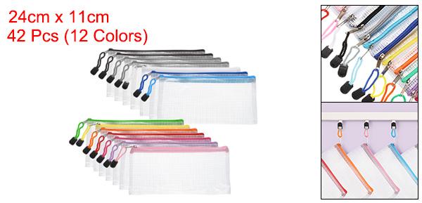 42個のメッシュジッパーポーチバッグ9.4" x 4.3"プラスチック防水メッシュファイルバッグクリアドキュメントジッパーポーチ教室家庭旅行オフィ ス用品整理 12色