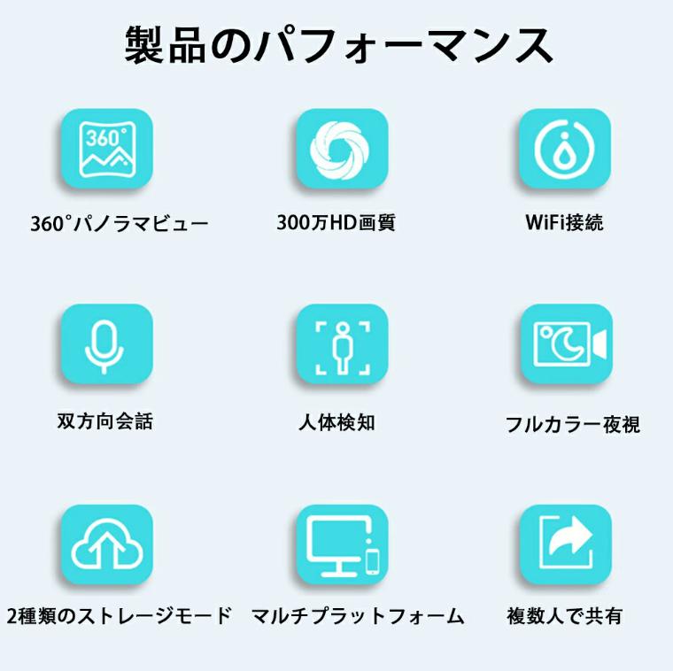 商品情報 センサ 1/4 Image Sensor 1054 ネツトフークサポート WIFI、APホツトスポツト 解像度 2304*1296 300万画素 最下位輝度 0.1LUX/F2.2 内藏力ード 最大128GB TF力ードをサポート(24日間音可能) レンズ焦点距離 3.6MMハイ ビジョンレンズ 電源装置 5V 1A ビデ才圧? Smart H.264 動作温度 -10°C-+45°C 使用湿度 10%-90% サポート言語 簡体字中国語、繁体字中国語、英語、ドイツ語、タ?語、?タリア、ベトナム、口シア語、日本語、スペイン、トルコなど
