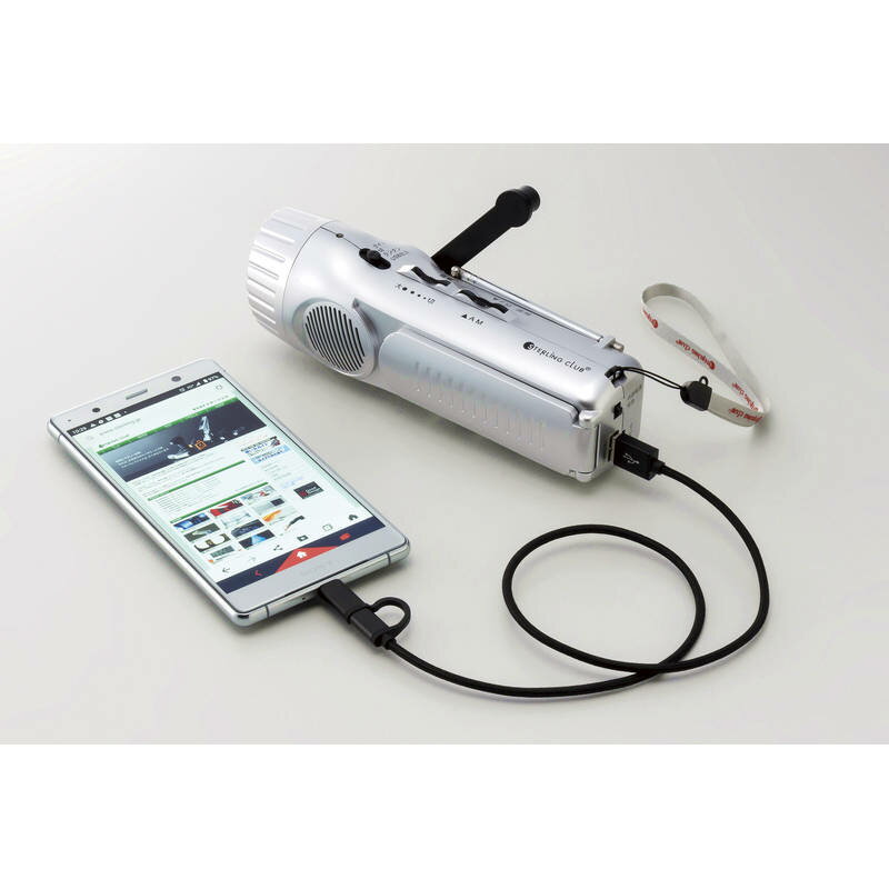 ・LEDライト1灯、LEDランタン3灯、AM/FMラジオ(ワイドFM対応)、サイレン、スマホ充電・4電源タイプ:ダイナモハンドル、乾電池、USB充電機能、AC/USBアダプター対応(別売)※iPhoneには純正ケーブルをご使用下さい。【パッケージサイズ】60×91×242mm【内容】177×52×60mm、2in1充電ケーブル(マイクロUSB/Type−C)、ストラップ【材質】ABS樹脂【電池】別売(単4電池3個)【ACアダプター】別売【生産国】中国【パッケージ形態】化粧箱入マルチポータブルチャージャー 6991E